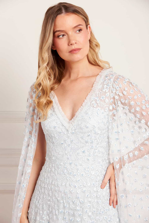 NEW SEASON. The Clover Cape Sleeve Ankle Gown in Ice Blue. A romantic silhouette featuring a softly gathered cape sleeve. Crafted from delicate tulle, the gown drapes beautifully over the shoulders for an ethereal, graceful effect.