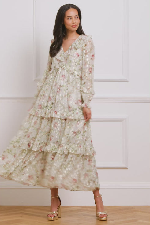The Colette’s Rose Cherie Lurex Ankle Gown in Moonshine. A graceful and subtly shimmering style. Crafted in lightweight georgette with metallic lurex thread, this gown features the Colette’s Rose vintage floral print – hand-painted roses framed by delicate diamond borders. A soft, flowing silhouette exudes timeless elegance.