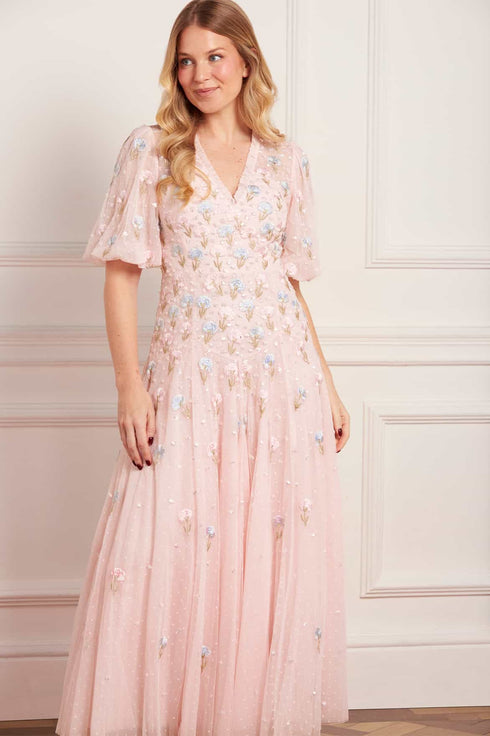 NEW SEASON. The Dandelion Ditsy Ankle Gown in Seashell. Decorated with delicately stitched dandelion motifs in soft pastel tones. Crafted from airy tulle that fades gently towards the hem, this gown captures a dreamy, ethereal feel perfect for special occasions.