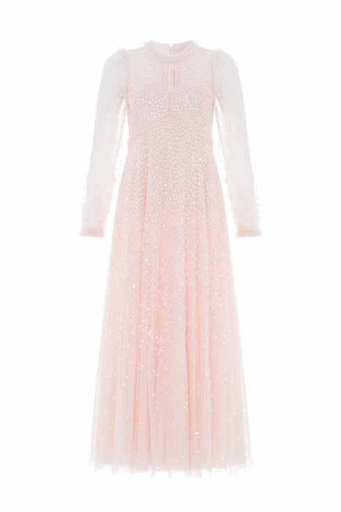 The Dappled Sequin Long Sleeve Ankle Gown in Opal. This look offers a soft and feminine take on evening sparkle. Tiny sequins are meticulously placed across the tulle fabric, fading towards the hem to create a celestial effect. The flattering long sleeves and ankle-length skirt make it a standout choice.