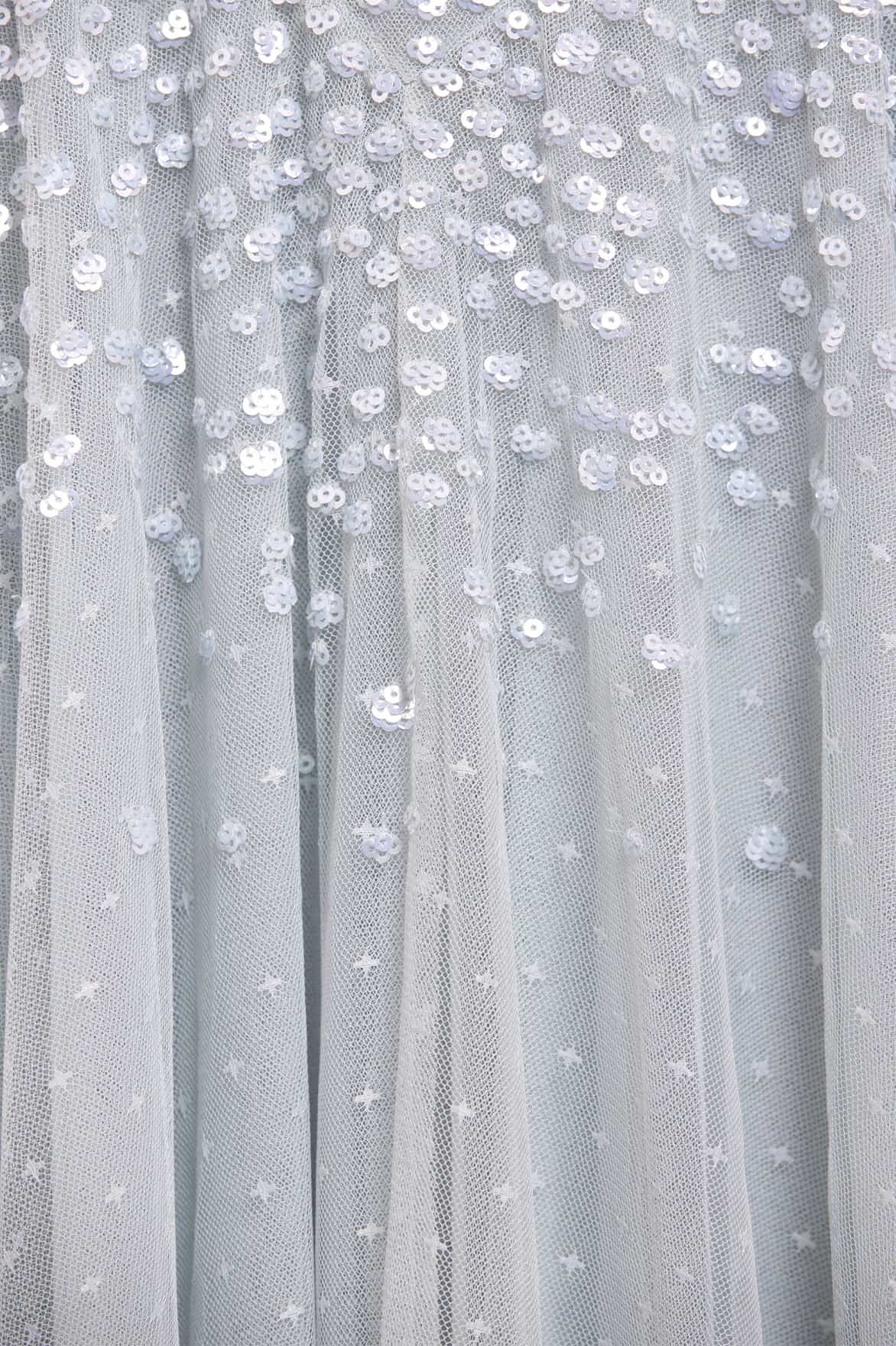 The Dappled Sequin Off-Shoulder Ballerina Dress in French Blue. This ballerina dress features shimmering clustered dot motifs that cascade towards the hem for a radiant effect. Its off-shoulder neckline is adorned with layered circle-cut frills, finished with signature Needle & Thread detailing. The dress is designed with flattering chevron seaming across the hips and a voluminous skirt crafted from layers of net and tulle, creating a dramatic, sweeping hemline. This dress is destined for truly unforgettable moments.