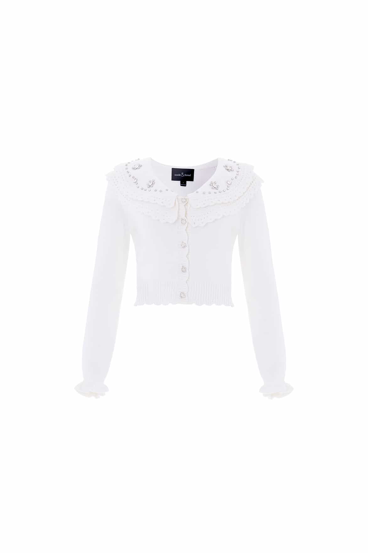 NEW SEASON | NEEDLE & THREAD EXCLUSIVE. The Embellished Collar V-Neck Cardigan in Cream. A refined knitwear piece with an elevated twist. Crafted from soft yarn and finished with a delicately embroidered collar, this cardigan adds a romantic touch to everyday looks. Wear buttoned up with the Ballet Kisses Ankle Skirt, or layer over a dress for a feminine contrast.