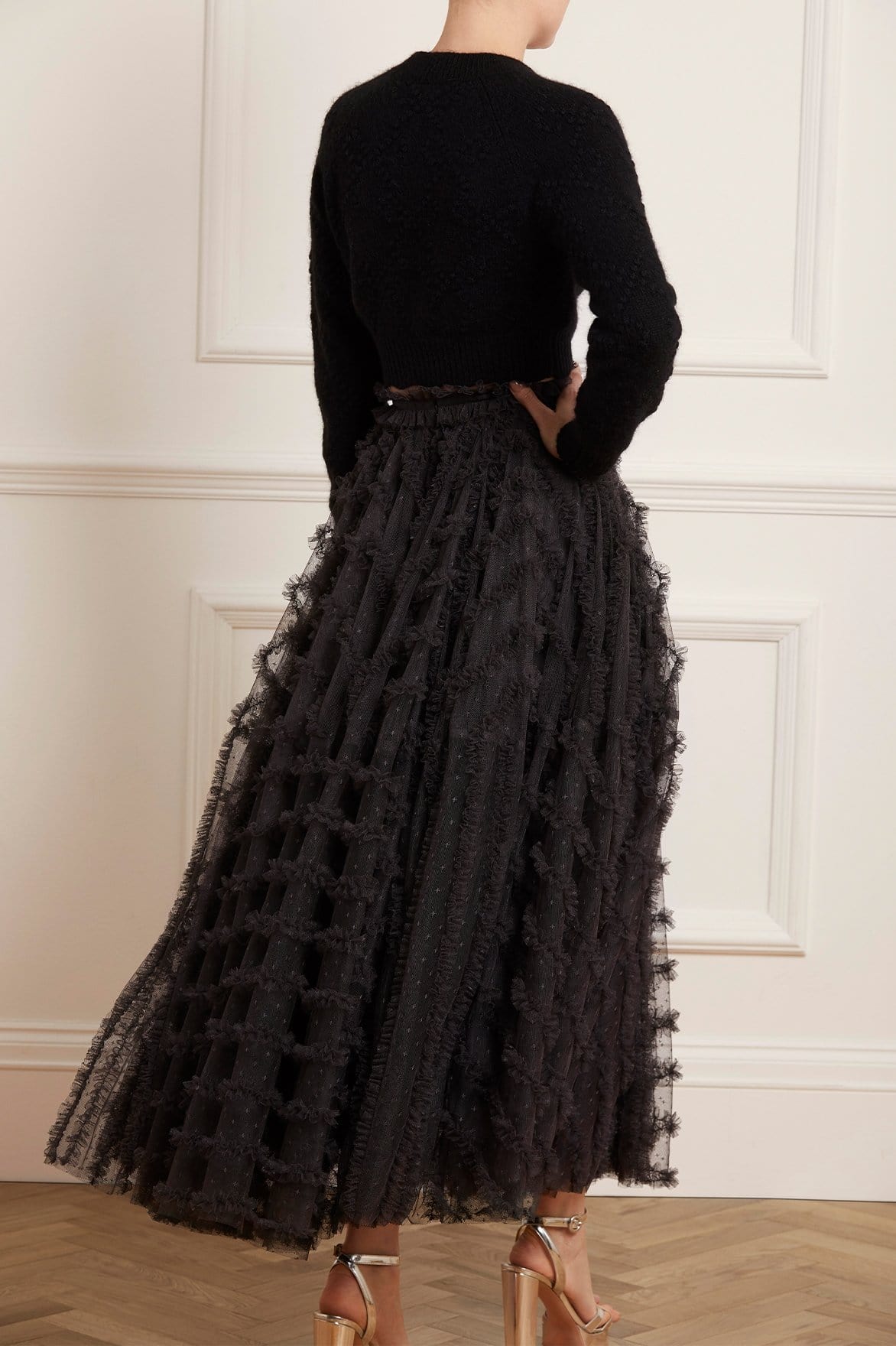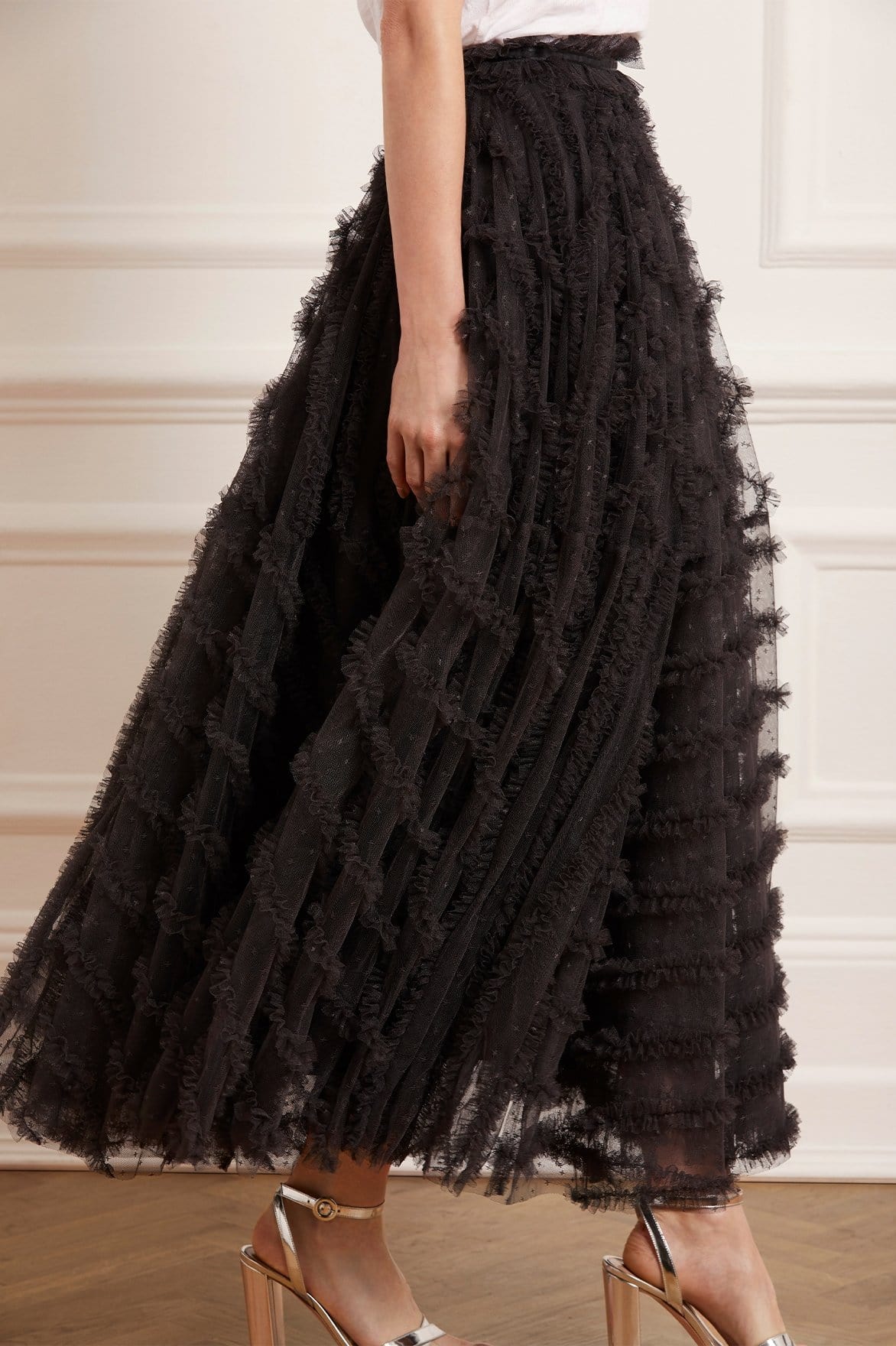 NEEDLE & THREAD EXCLUSIVE. The Florence Ruffle Ankle Skirt in Graphite. This beautiful skirt is crafted with layers of tulle, creating a voluminous romantic look. The ankle-length skirt is designed elegantly with a satin waistband and gathered neatly with tulle trims. Pair with your favourite top and make an entrance this season.