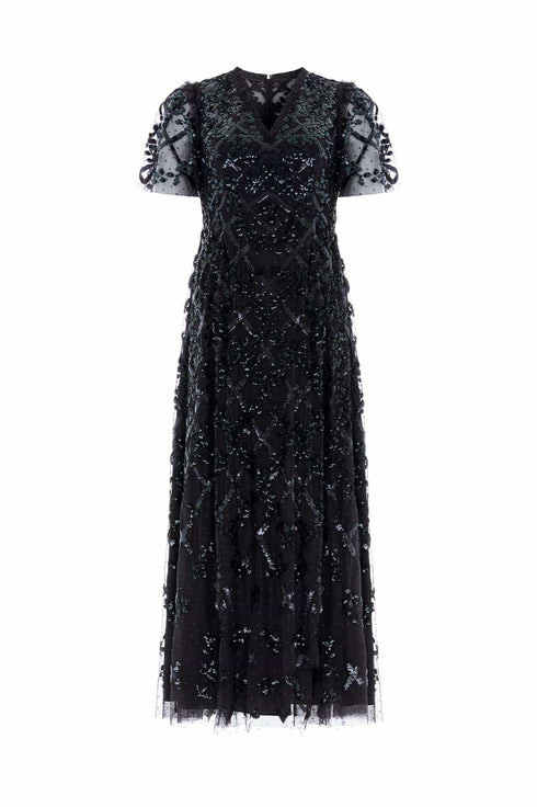 The Garden Lattice Ankle Gown in Graphite. This gown is designed with beautiful artwork incorporating delicate florals in a grid layout. Decorated with two sequin colours to highlight the definition of the design. Crafted with a V-shaped waist creating a flattering, easy-to-wear silhouette. Make a statement this season in the Garden Lattice.