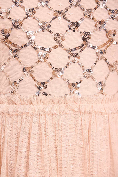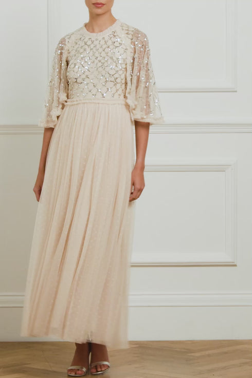 The Heart Lattice Bodice Cape Ankle Gown in Dust Beige/Silver. The bodice of the gown is decorated with intricate embellishments made using the smallest sequins for exquisite detailing. Beautifully designed with heart-shaped motifs in a lattice layout. Developed with signature Needle & Thread soft tulle trims and a layered skirt for romantic detailing and a statement look. The perfect gown for a bridesmaid moment or an upcoming special occasion.