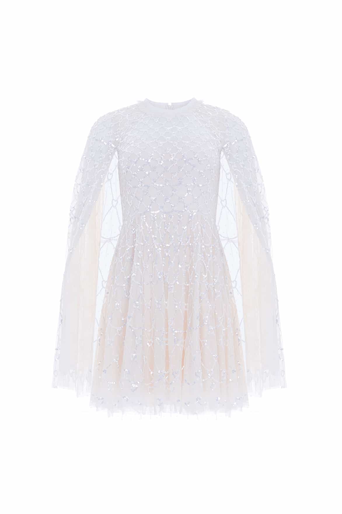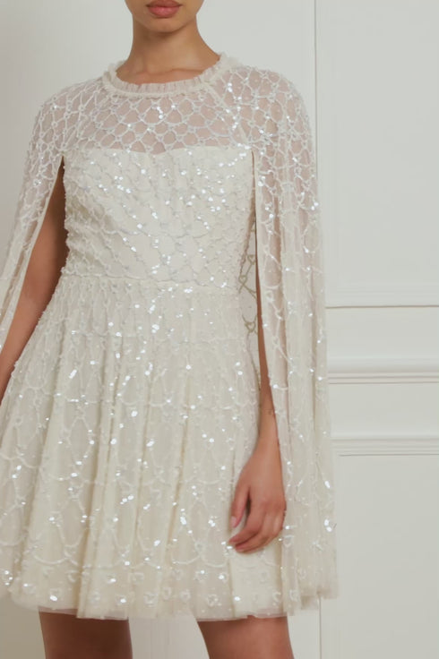 The Heart Lattice Micro Mini Dress in Cream. This dress is decorated with intricate embellishment made using the smallest sequins for exquisite detailing. Beautifully designed with heart-shaped motifs in a lattice layout. This dress features a cape for romantic detailing and a statement look. Make an entrance at your next event.