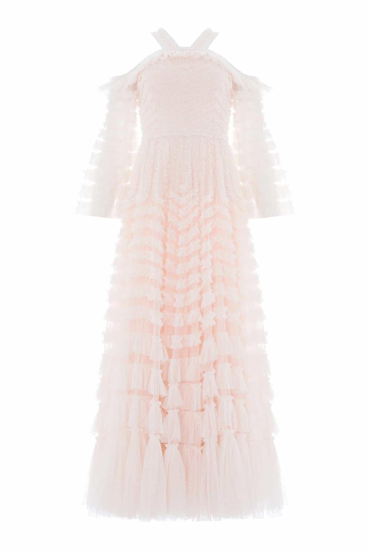 The La Vie En Rose Off-Shoulder Gown in Opal/Cream. Soft tulle ruffles and frothy gathered frills complement the figure with a flattering neckline and contouring silhouette, the graduated frill detailing adds texture and movement. A romantic option for unforgettable moments.