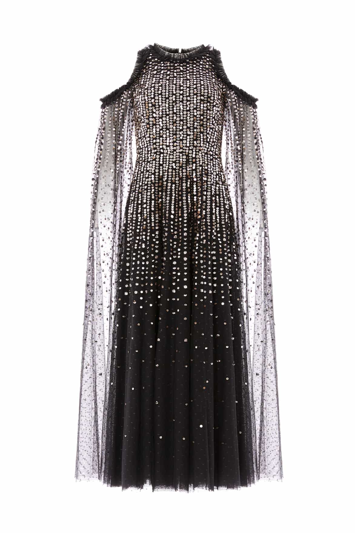 NEW SEASON. The Moonlight Sequin Cape Sleeve Ankle Gown in Graphite/Metallic. Inspired by the shimmer of moonlit skies, this gown features delicate sequins cascading from a fitted bodice into a fluid skirt. The dramatic cape sleeves create celestial movement, while the graphite base contrasts beautifully with metallic shimmer; a piece for unforgettable evenings.