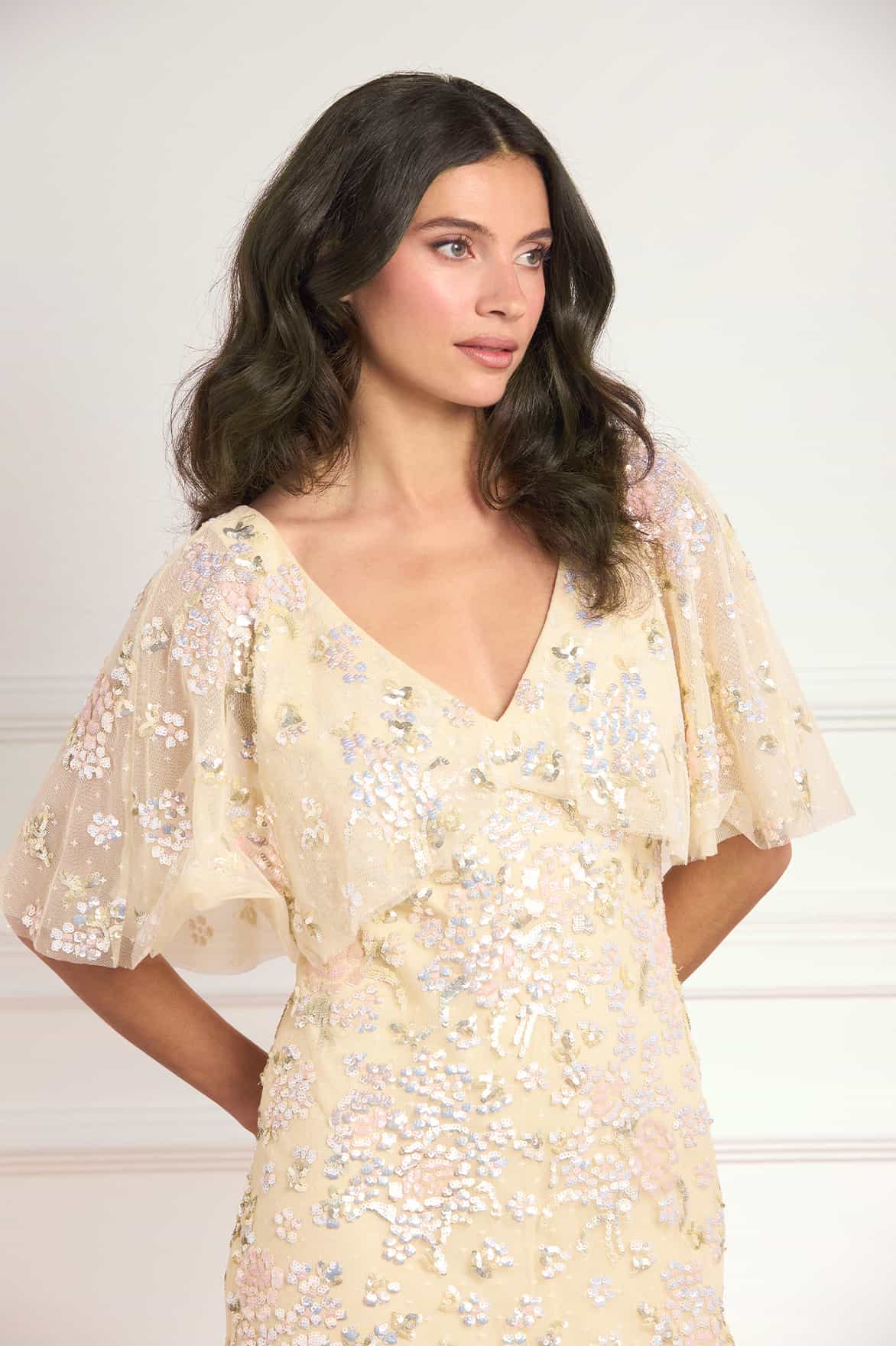 NEW SEASON. The Peony Bouquet Sequin V-Neck Cape Gown in Lemon Sorbet/Multi. Exquisite sequin floral artwork inspired by antique botanical paintings adorns this elegant gown. Designed with an integrated cape and a slim silhouette, it is finished with a bias-cut lining for a smooth, body-skimming fit and effortless wear.