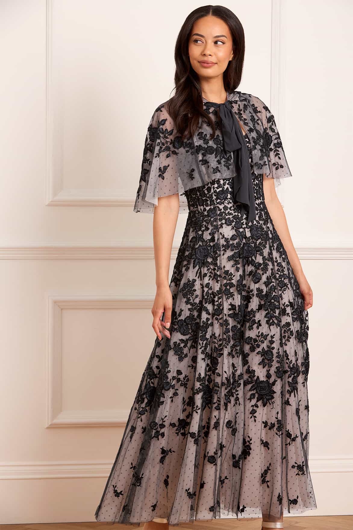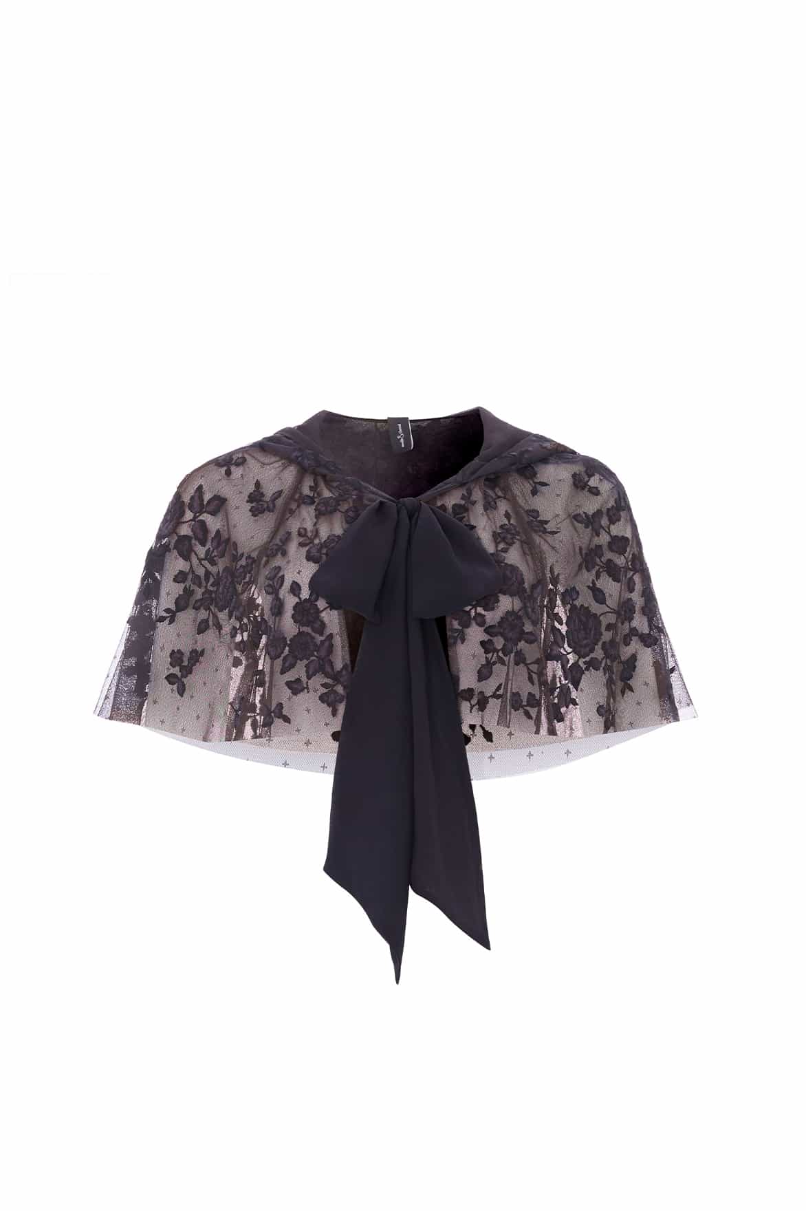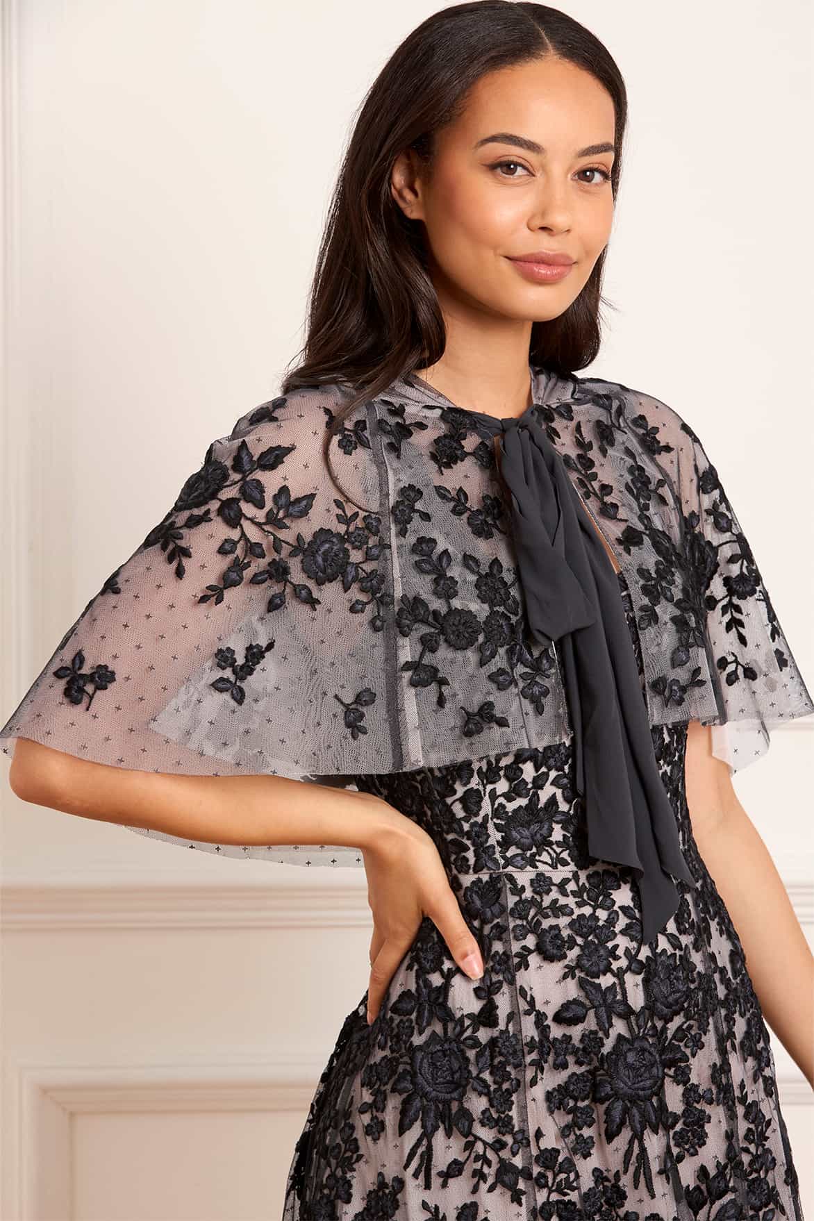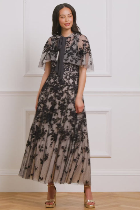 The Rosa Hooded Short Cape in Graphite/Opal. This cropped embroidered cape is designed to complement the matching Rosa Scoop Neck Ankle Gown. Adorned with bold rose and ditsy motifs, the cape fastens with a soft chiffon bow at the neckline. Perfect for making a dramatic and romantic statement.