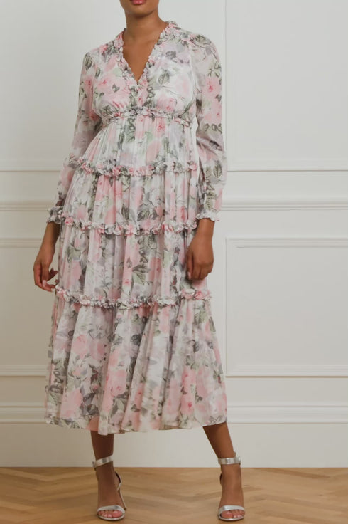 The Rose Powder Chiffon Ankle Gown in Moonshine. This gown is inspired by a 1900s hand-painted wallpaper design. Beautifully printed with florals in faded pastels for a vintage look. Developed with a soft chiffon fabric with a loose fitting silhouette for effortless styling. Designed with an upwards V-shaped waistline to create a flattering fit, gathered ruffles and skirt tiers for a signature Needle & Thread look. A versatile piece you'll forever cherish.