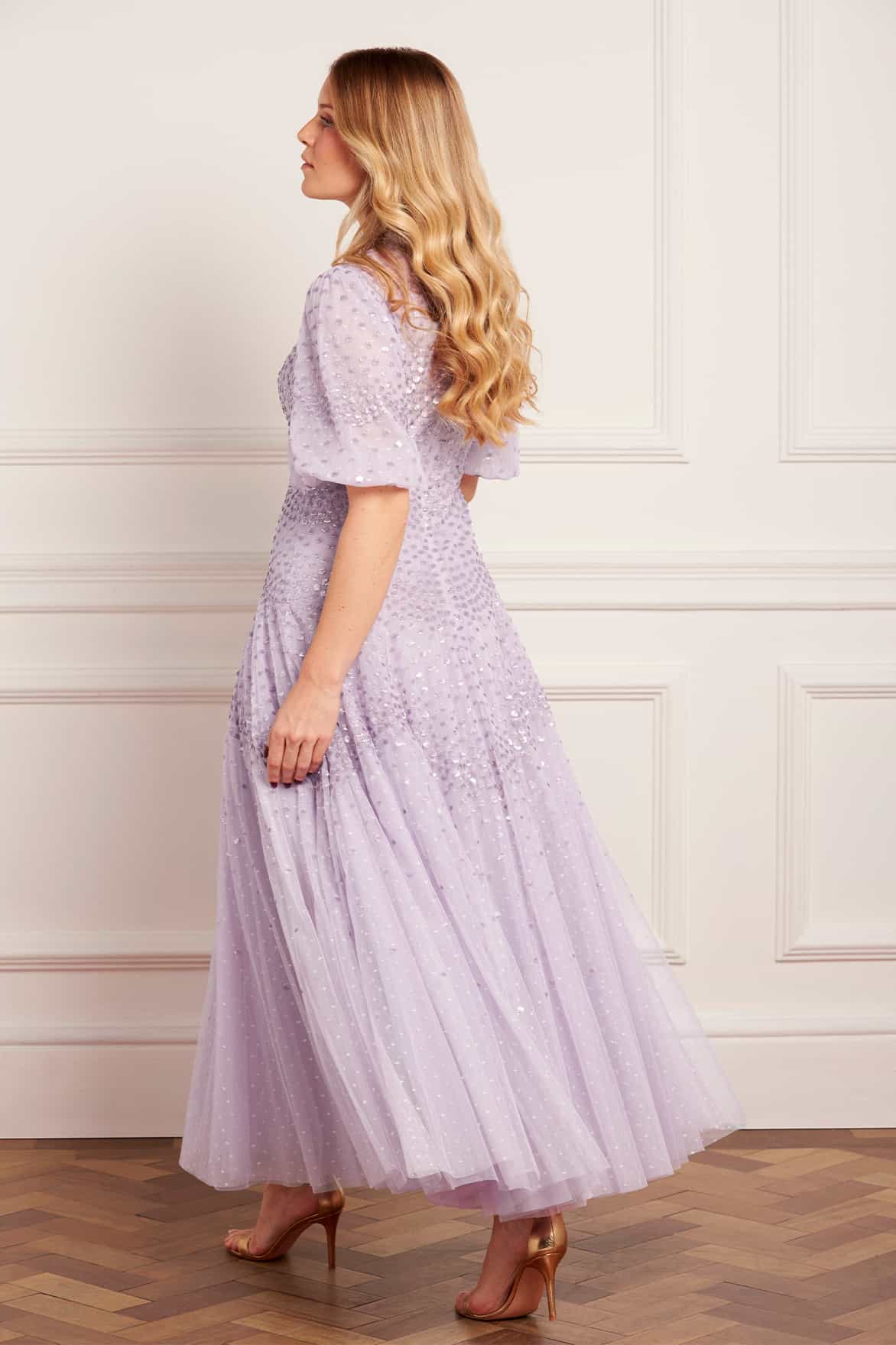 NEW SEASON. The Scallop Sequin V-Neck Ankle Gown in Lavender. Features luminous sequins cascading across soft tulle. Designed with a flattering V-neckline and flowing silhouette, this gown radiates understated elegance.