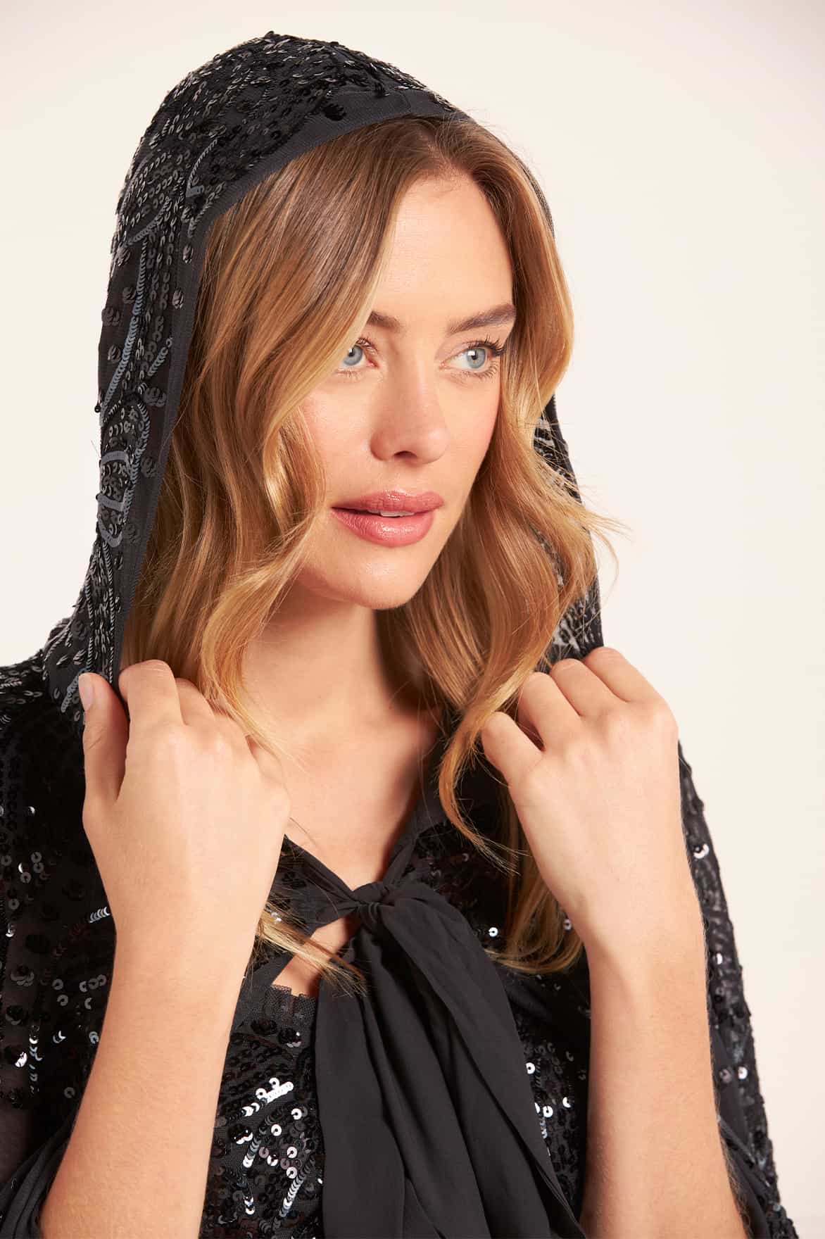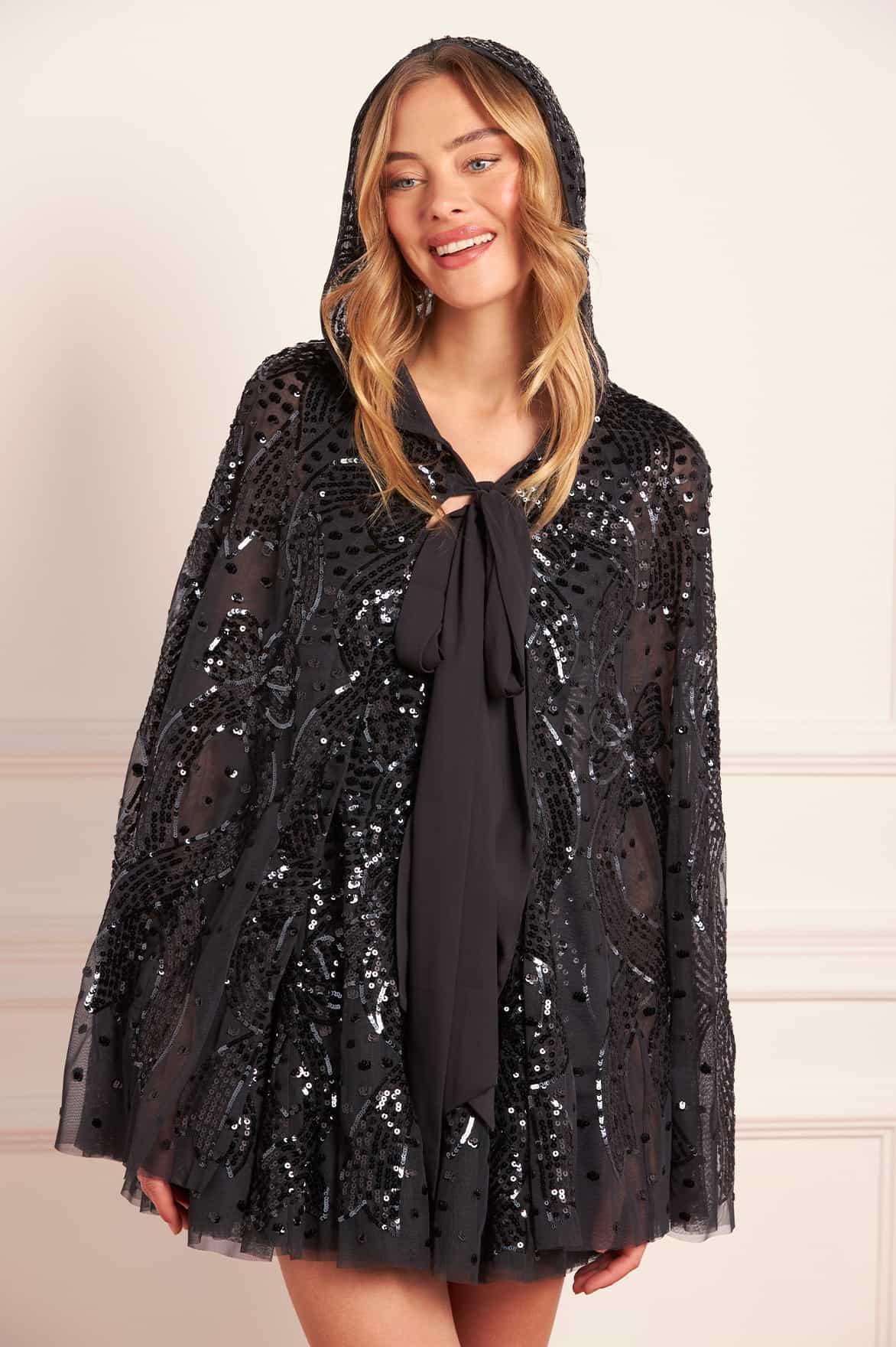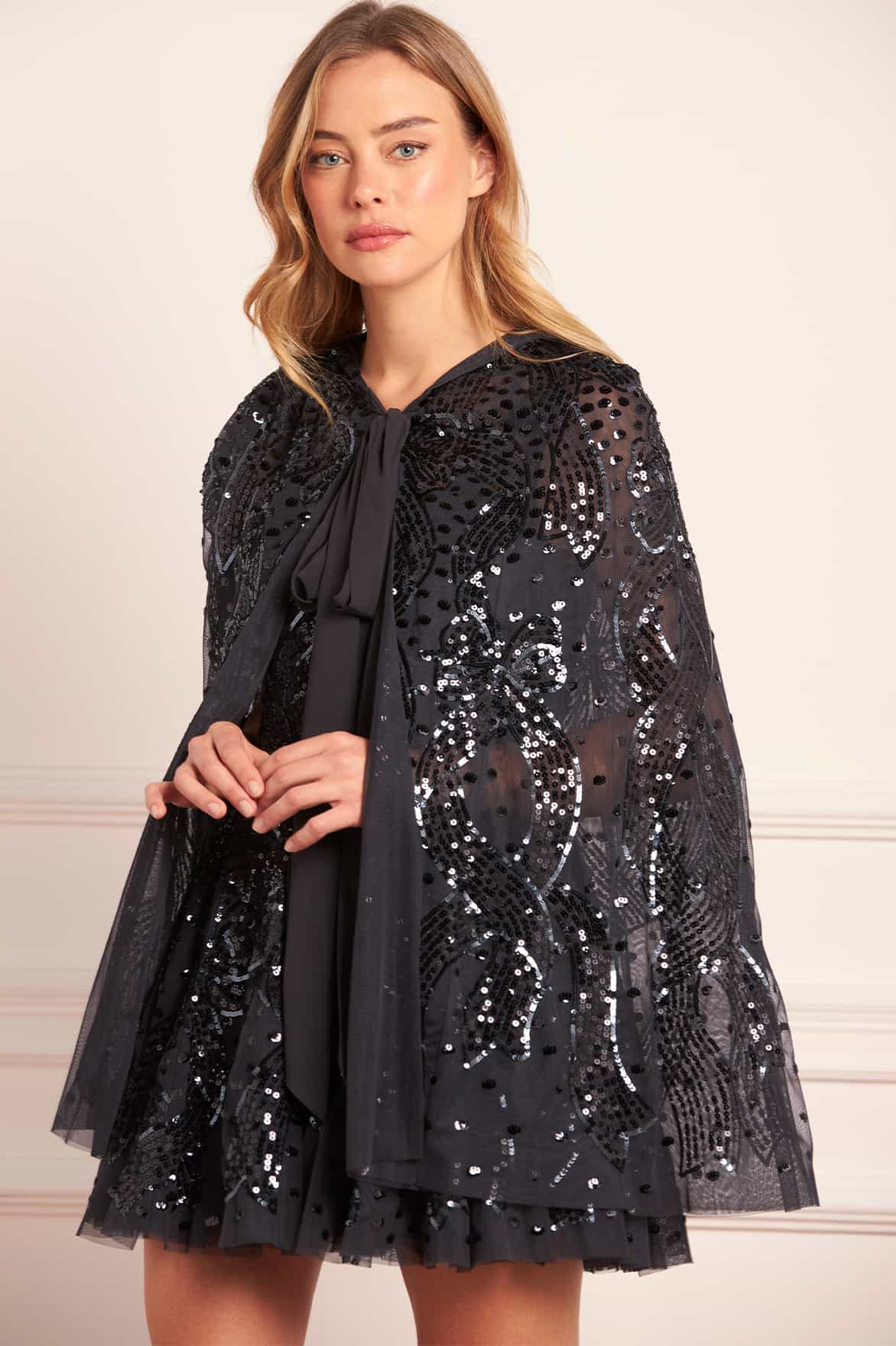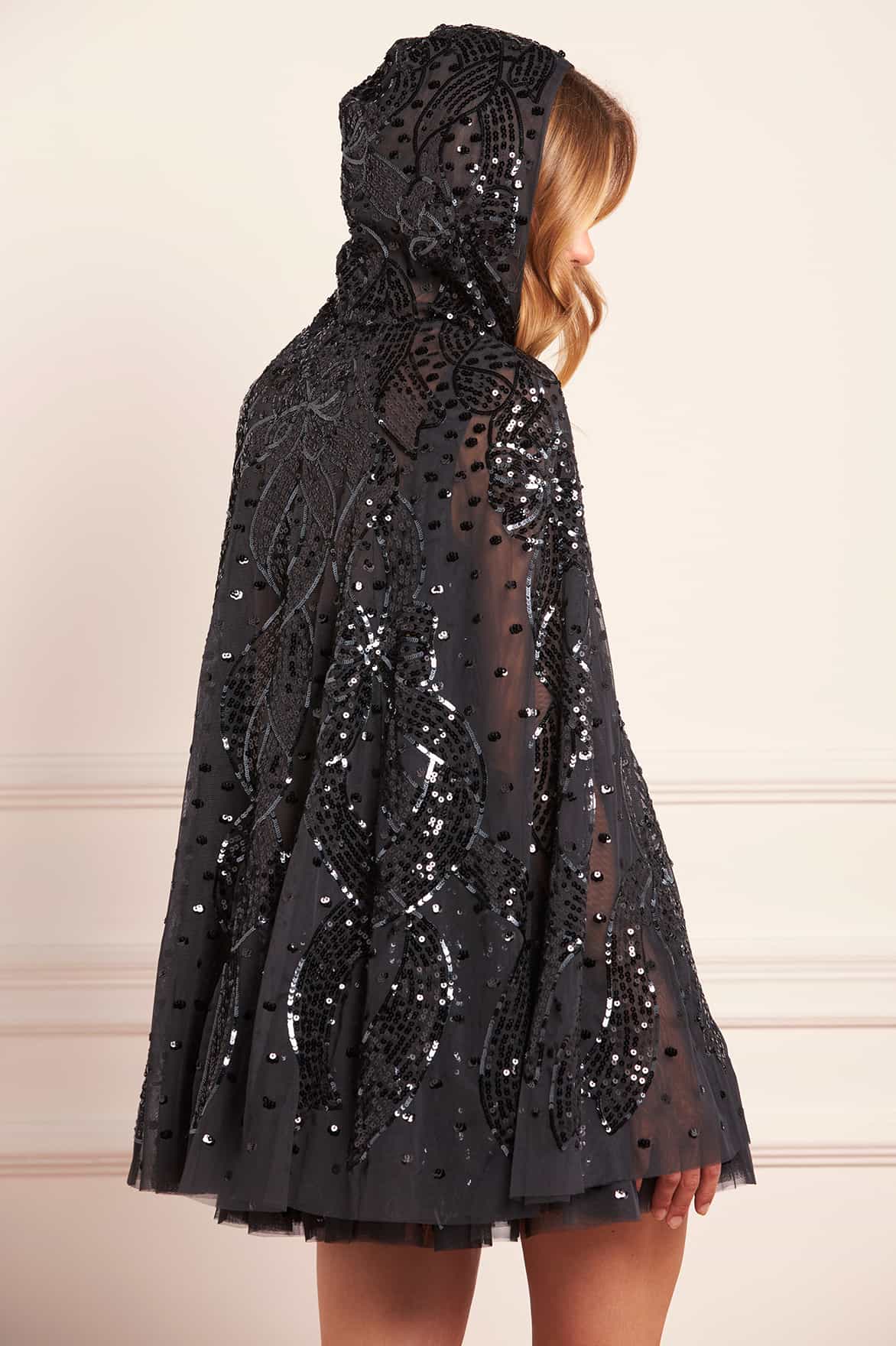 NEW SEASON. The Sequin Ribbon Hooded Cape in Graphite. A couture-inspired outerwear piece, designed with the Bright Star collection’s cosmic influence. Embroidered with glittering ribbon motifs, the cape sparkles with every movement. The addition of a dramatic hood brings theatrical flair, while the graphite shade adds mystery. A striking layer to transform evening looks.