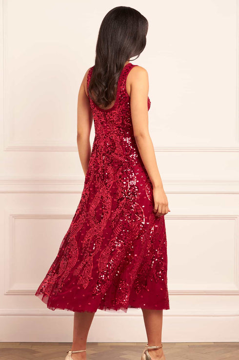 NEW SEASON. The Sequin Ribbon Scoop Neck Ballerina Dress in Red. Featuring a scoop neckline and ribbon sequin embroidery, the fitted bodice flows into a frothy ballerina skirt of layered tulle. The red palette enhances its vibrancy and bold spirit, making it a perfect choice for memorable evenings.