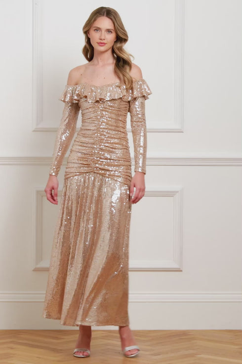The Sienna Off-Shoulder Gown in Butterscotch. This elegant gown features a dramatic off-shoulder neckline adorned with delicate circle-cut frills. Crafted from sheer sequin fabric with tiny 3mm sequins hand-stitched onto stretch mesh, it offers a soft, fluid shimmer throughout. Flattering ruching shapes the bodice, while an internal stretch power mesh corset provides comfort and support. Finished with soft boning, grosgrain ribbon detailing, and adjustable fastenings, this piece blends modern glamour with couture craftsmanship.