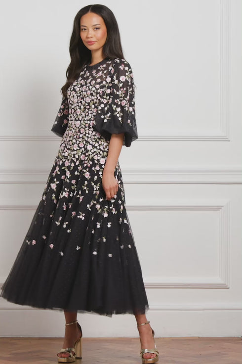 NEW SEASON. The Sylvia Rose Round Neck Ankle Gown in Graphite/Multi. Embroidered roses in multi-tonal threads cascade across graphite tulle, with scattered ditsy motifs adding softness. The slim silhouette and round neckline make this gown both wearable and impactful; perfect for modern romance.