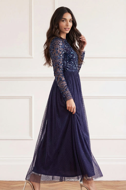 NEEDLE & THREAD EXCLUSIVE. The Tempest Bodice Ankle Gown in Navy. This ankle dress is inspired by a vintage lace tablecloth design, embellished with shimmering sequins all over the bodice. Designed with long sleeves, a layered tulle skirt with an 'x' motif and frill trim detailing around the neck. Make an entrance in the Tempest.