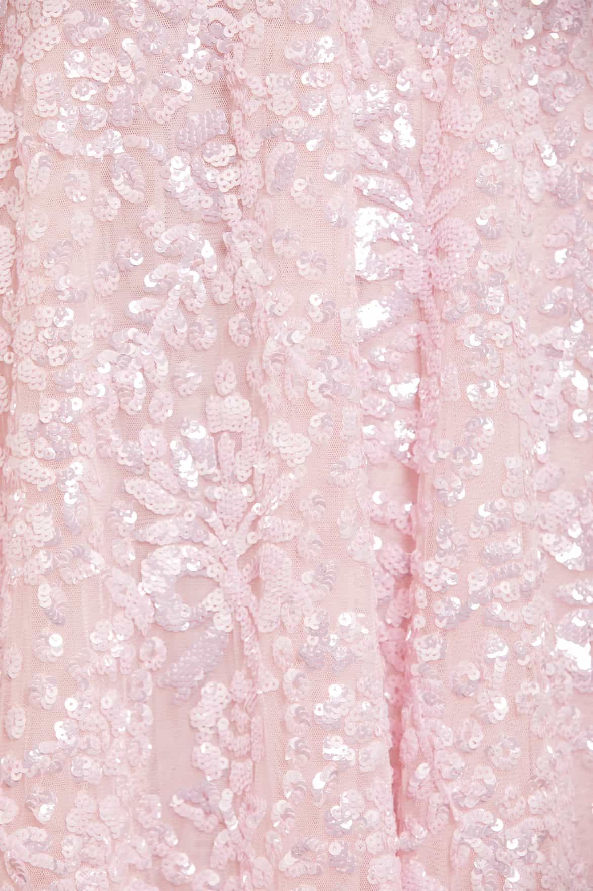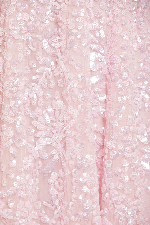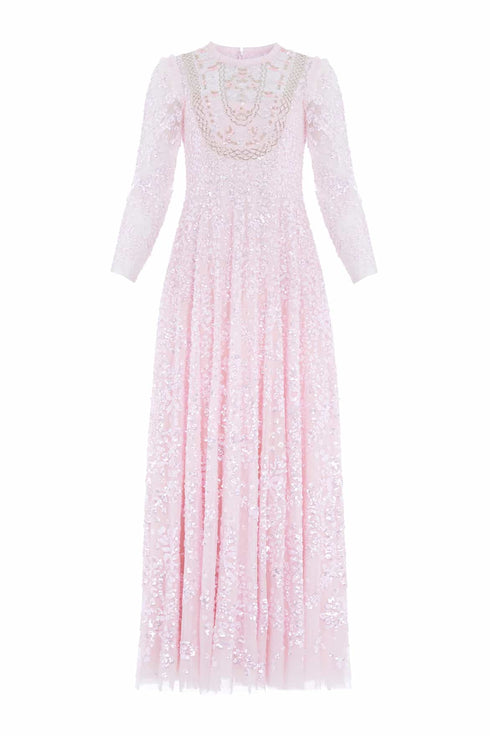 The Victorian Wreath Gloss Long Sleeve Gown in Peony Pink. This gown takes inspiration from Victorian panelling details. Beautifully adorned with an intricate sequin artwork featuring floral and bow motifs in a repeated wreath layout. Needle & Thread have sourced special sequins with extra foil coating to create an ultra high shine look. This gown is perfect for an upcoming special day.