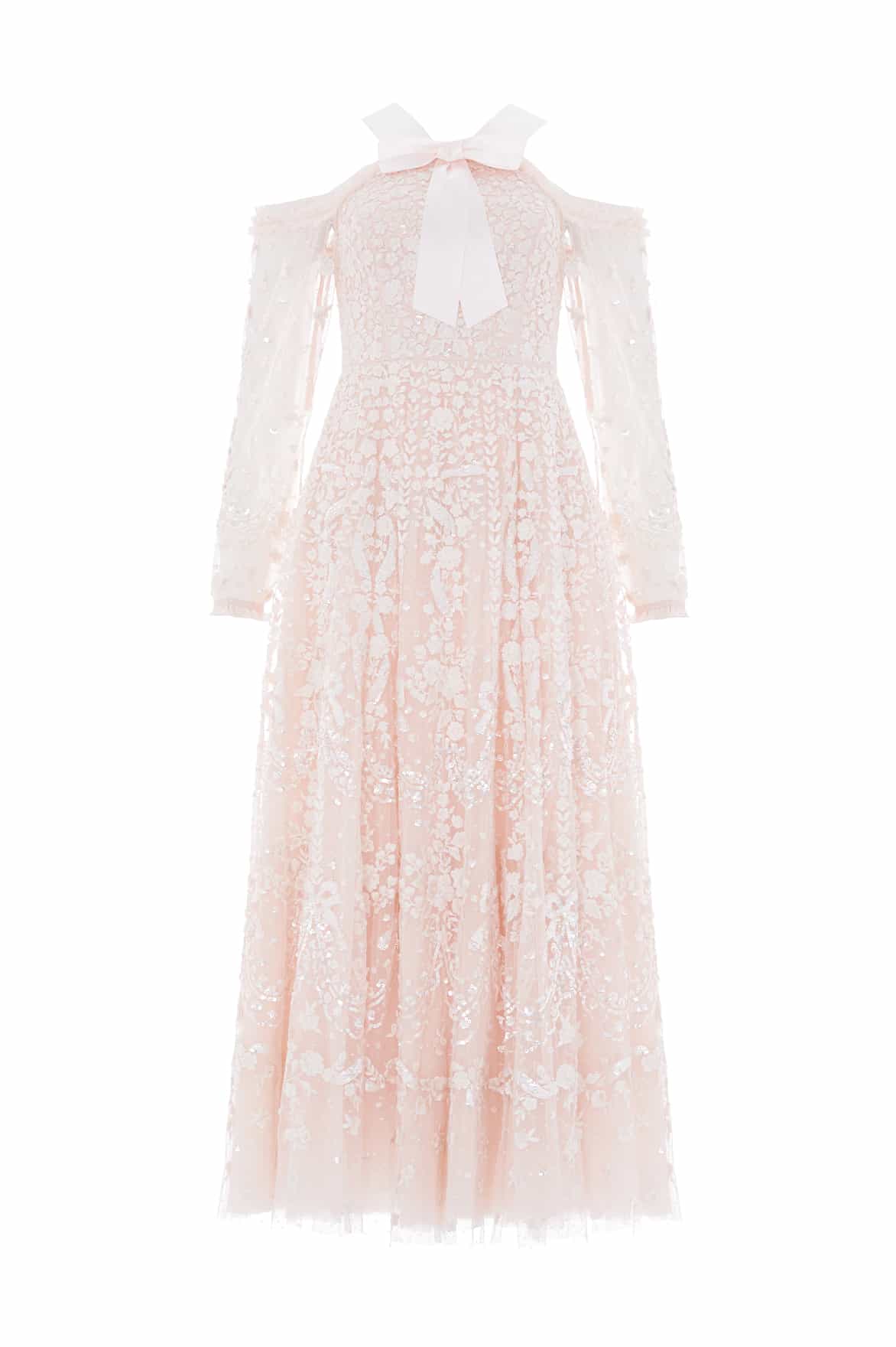 The Adeline Off-Shoulder Ankle Gown in Opal/Cream. A dramatic take on evening elegance. Delicately embroidered with Victorian-era inspired florals, bows and scallops in contrast graphite thread, this off-shoulder silhouette embraces romance with a contemporary twist. Shimmering sequin embellishments enhance the flattering fitted bodice, while the ankle-length skirt flows into a cascade of softly glinting florals.