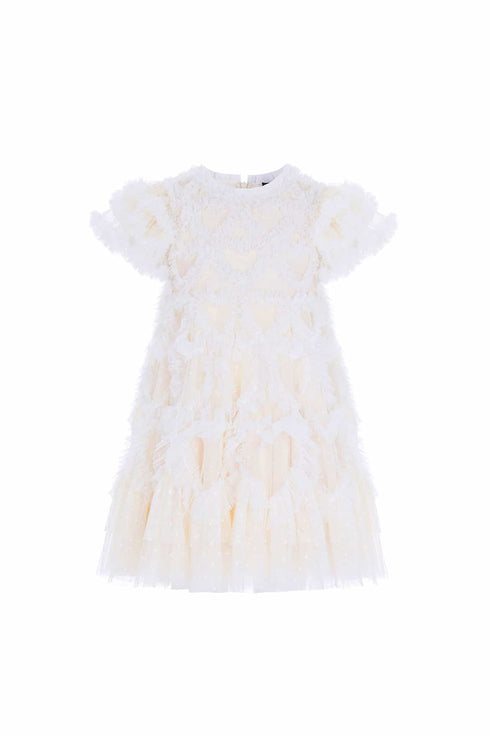 NEW SEASON. The Amorette KIDS Dress in Cream. A signature Needle & Thread KIDS dress for the season ahead. Beautifully adorned with a love heart motif, made from gently gathered delicate tulle. Designed with playful, frothy sleeves created by using layers of delicate tulle and frills. Featuring a generous, voluminous skirt layered with tulle and net for a magical silhouette. The perfect mini-me version of our RTW style.