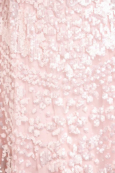 NEW SEASON. The Anais Sequin Gown in Seashell. Adorned with intricate sequin artwork inspired by early 1900s French lace. Designed with a soft fitted bodice and a flowing tulle skirt, this seashell-toned gown shimmers delicately, perfect for romantic evening occasions.
