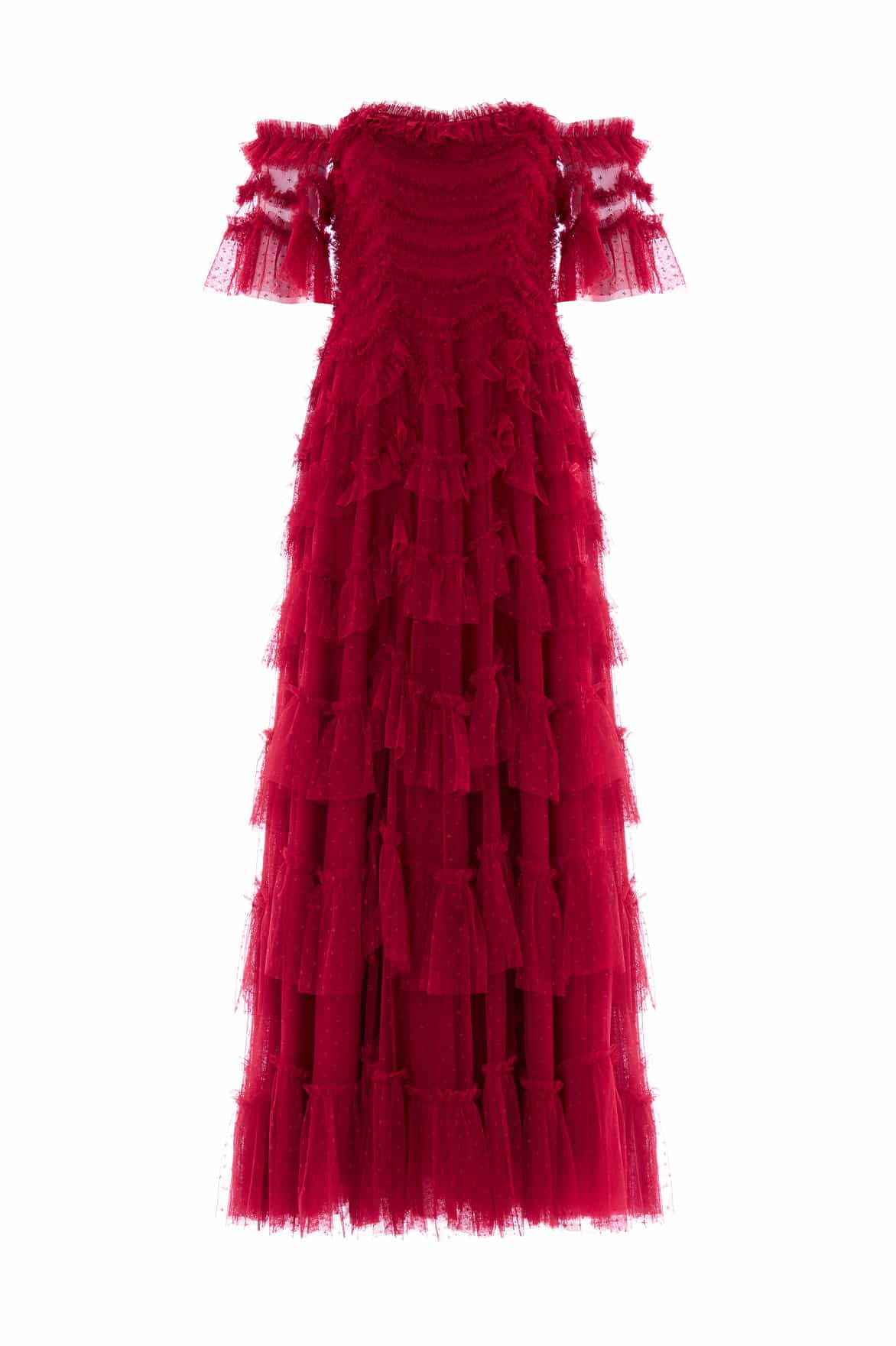 NEW SEASON. The Aviana Off-Shoulder Gown in Red. Romantic dressing is reinvented with a dramatic palette. Crafted from sculptural rows of soft tulle frills, this statement gown features scallop-tiered layers that build volume and romance. The rich red shade amplifies the gown’s drama, evoking passion and intensity.