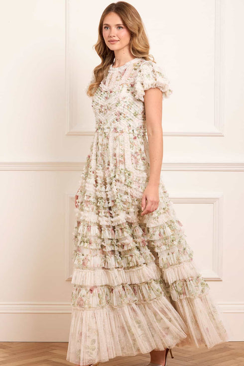 The Colette’s La Vie En Rose Round Neck Short Sleeve Gown in Moonshine/Cream. A dreamy silhouette adorned with delicate tulle frills. Soft ruffles follow the seams of the gown, while romantic florals from the Colette’s Rose print bloom across the moonshine-toned base. A gentle round neckline and short sleeves offer a flattering finish, ideal for refined dressing.