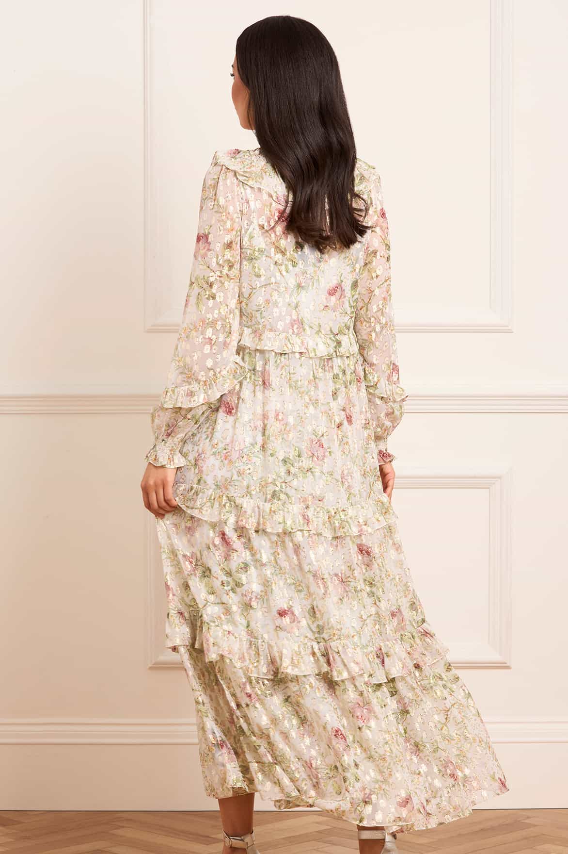 The Colette’s Rose Cherie Lurex Ankle Gown in Moonshine. A graceful and subtly shimmering style. Crafted in lightweight georgette with metallic lurex thread, this gown features the Colette’s Rose vintage floral print – hand-painted roses framed by delicate diamond borders. A soft, flowing silhouette exudes timeless elegance.