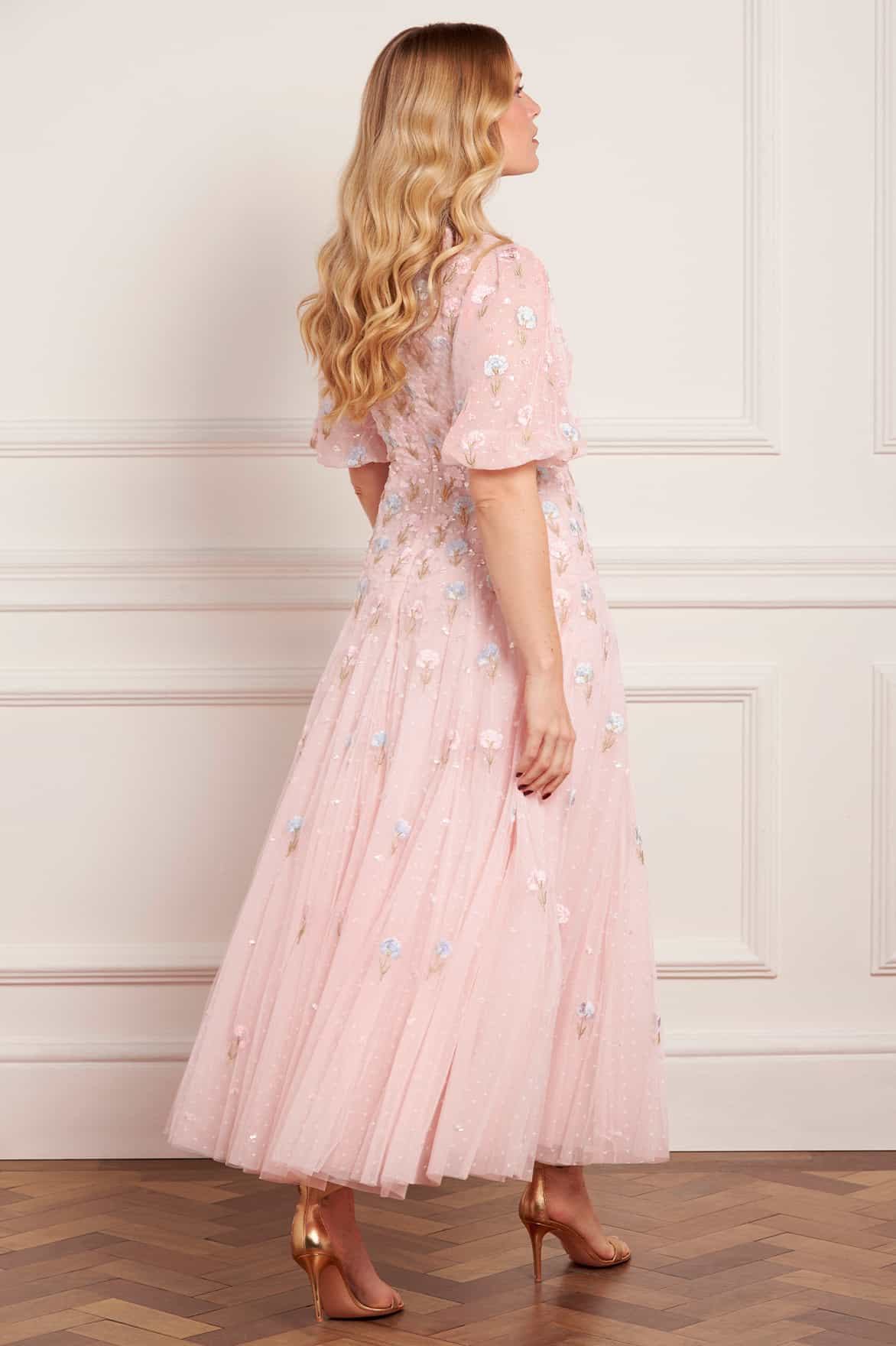 NEW SEASON. The Dandelion Ditsy Ankle Gown in Seashell. Decorated with delicately stitched dandelion motifs in soft pastel tones. Crafted from airy tulle that fades gently towards the hem, this gown captures a dreamy, ethereal feel perfect for special occasions.