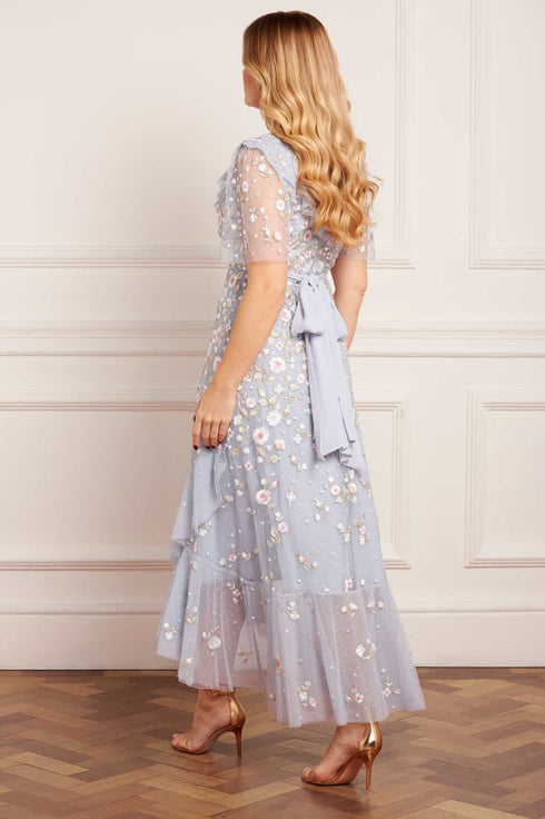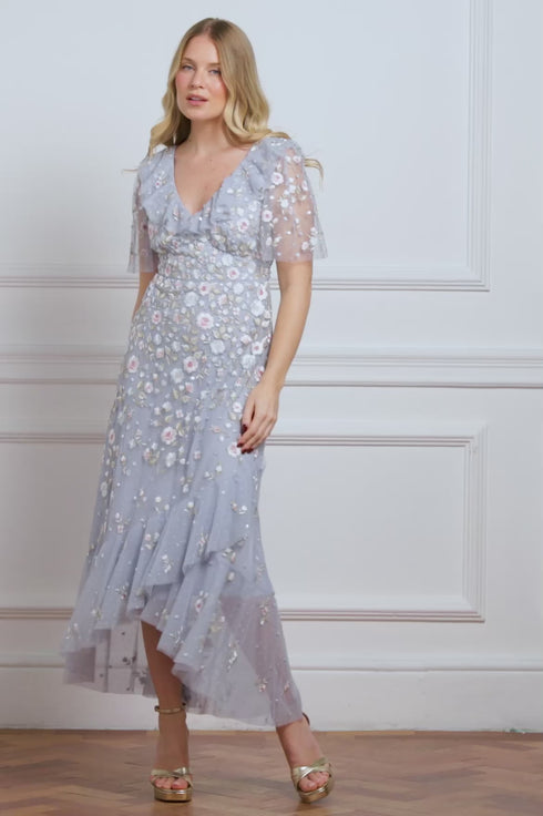 NEW SEASON. The Ethereal Blooms Frill Ankle Gown in Skylight/Multi. A romantic tulle design featuring exquisite floral embroidery interspersed with subtle sequin motifs. Finished with delicate frill detailing and soft pastel tones, this gown exudes lightness and refined grace.