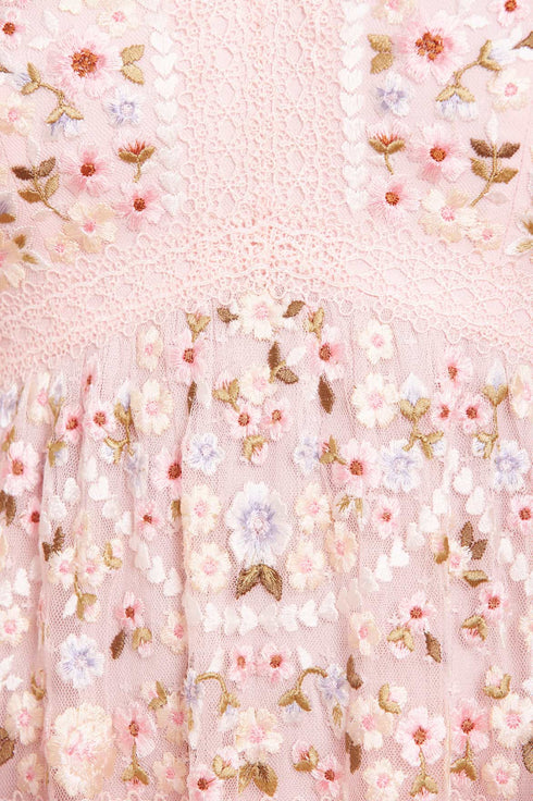 The Garland Ribbon Midaxi Dress in Peony Pink. This embroidered dress is inspired by Victorian lace trims. Beautifully designed with floral embroideries in soft pastel tones. Developed with a V-shaped waist seam to create a flattering, effortless fit. This dress is adorned with intricate lace trims for signature Needle & Thread detailing. A pretty piece you'll forever treasure.