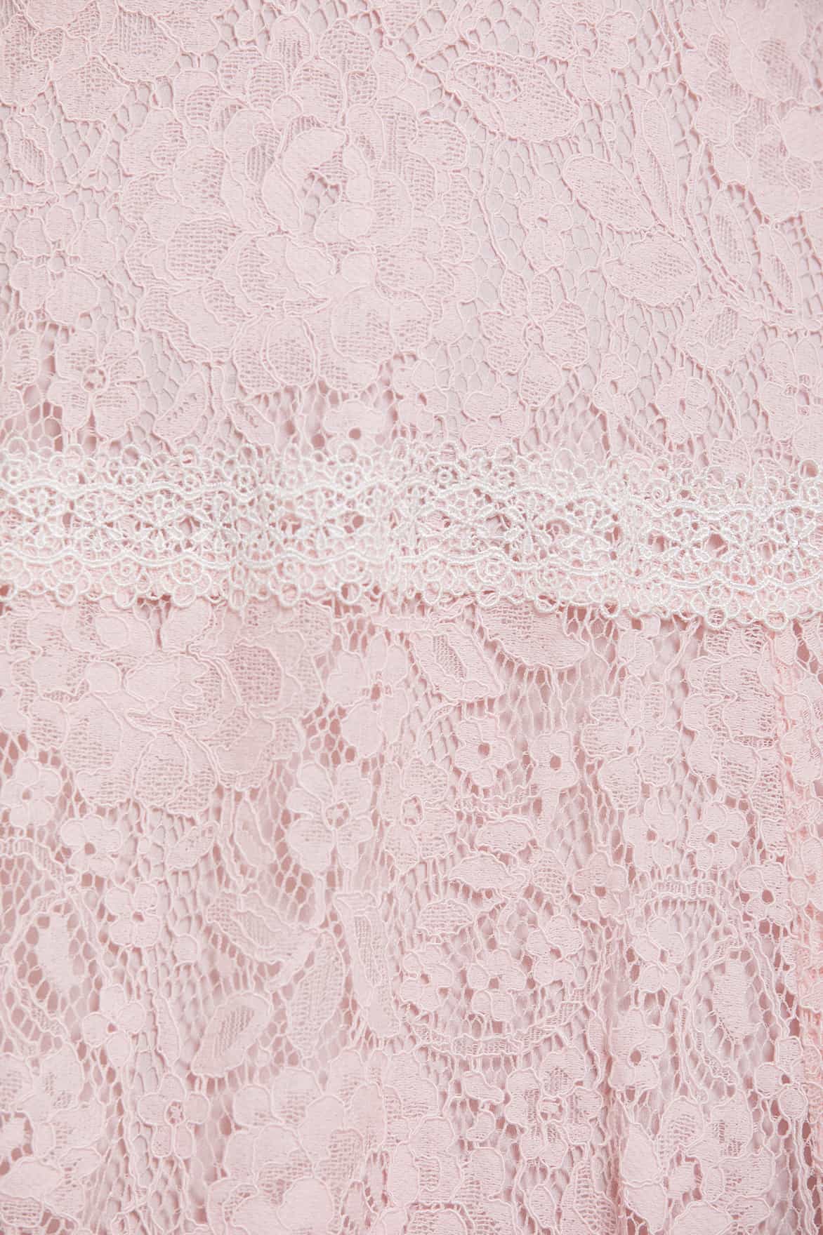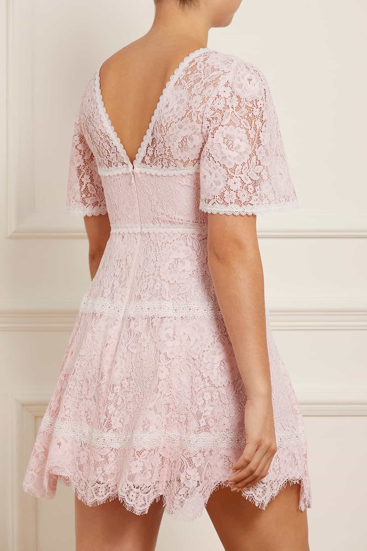 The Lace Primrose Micro Mini Dress in Sky Pink / Moonshine. This dress is beautifully designed with a soft, pastel colourway and subtly contrasting intricate lace trims throughout to create a playful romantic piece. Crafted with a flattering silhouette and engineered with a scallop lace finish. Make an entrance in the Lace Primrose.
