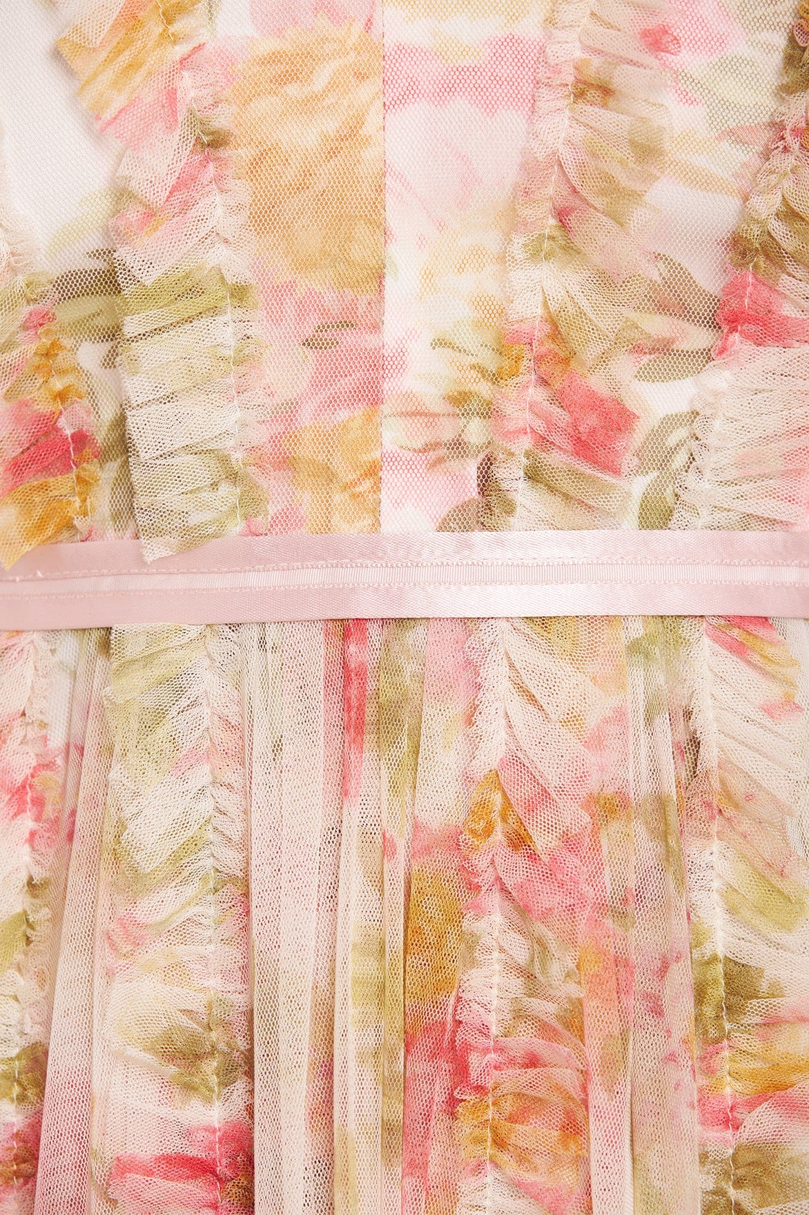 Peony. Promise V-Neck Gown in Moonshine. This gown is printed beautifully with hand-painted sunset pink peonies.. Beautifully created in our soft, delicate tulle fabric for a romantic look. Developed with gently gathered frills, stitched vertically throughout this style to create an ethereal texture to this signature Needle & Thread style. A style you'll wear time and time again.