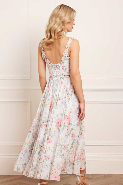 The Pompadour Garden Chiffon Smocked Cami Ankle Gown in Moonshine. This elegant dress is inspired by the opulent wall coverings of the Palace of Versailles, featuring hand-painted floral bouquets and trailing ditsy motifs for a regal touch. Crafted from the softest chiffon, it showcases a shirred bodice adorned with signature Needle & Thread frills at the neckline, shoulders, and waist. The cami straps are decorated with delicate frills, while the softly gathered skirt flows gracefully and is fully lined for added comfort and luxury.