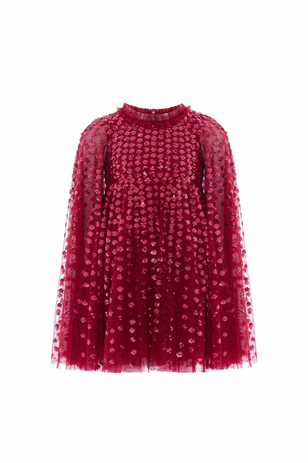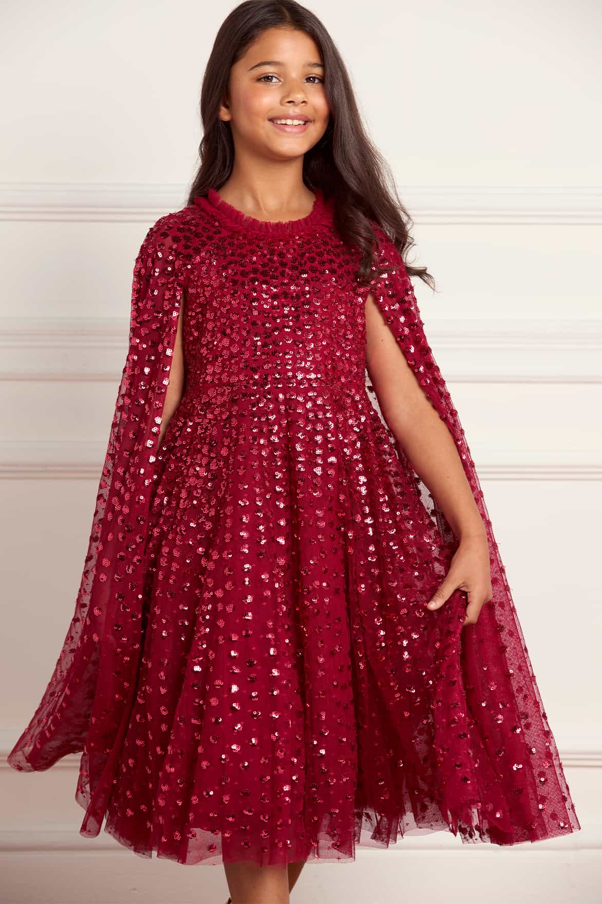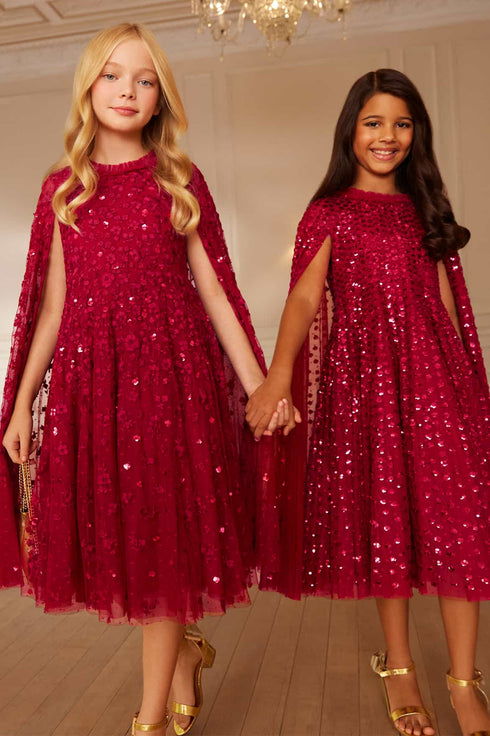NEW SEASON. The Raindrop Cape Kids Dress in Red. Embroidered with sequins that scatter like falling stars, the gown features cape sleeves for dramatic effect and a flowing skirt for playful twirling. The red tone adds festive vibrancy, making it ideal for party season and celebrations. Pair with the Raindrop Cape Ankle Gown in Red from the adult collection for a coordinated look.