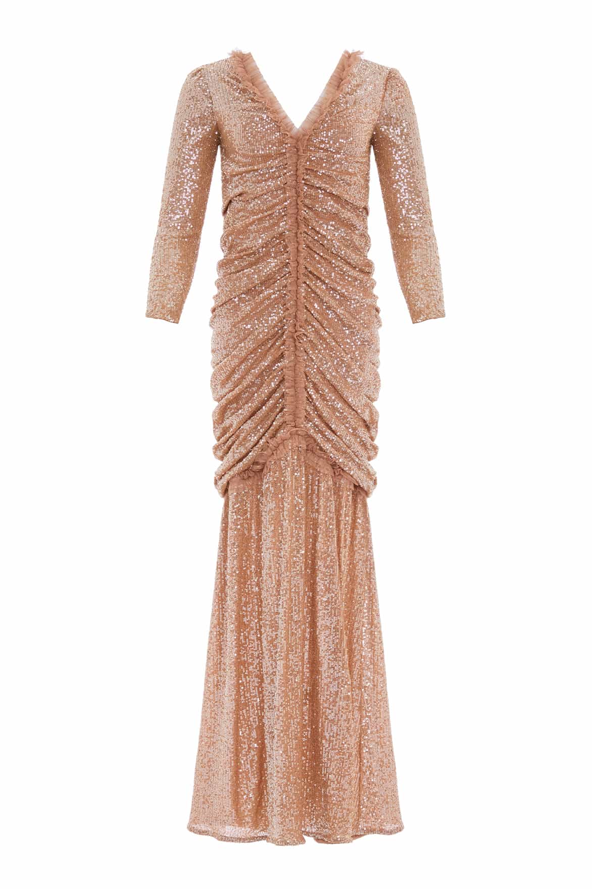 The Starlight Long Sleeve Gown in Caramel. Specially developed all-over sequin fabric is created using the tiniest 3mm sequins, carefully and delicately stitched to the stretch mesh base to create a shimmering effect. Expertly draped in our London atelier, the fabric is gathered with tulle frill details to perfect the flattering silhouette and add statement Needle & Thread styling. Fully lined in heavier-weight power mesh, the gown ensures ultimate fit and comfort. The frill-edged V neckline and slim sleeves complete the elegant silhouette. The perfect gown for an upcoming special occasion.