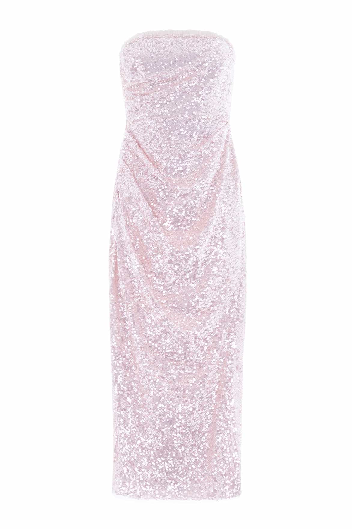 The Stellar Gloss Strapless Ankle Gown in Dusk Pink. A brand new design for the season ahead. The Stellar is beautifully adorned with specially sourced gloss sequins for extra sparkle and shimmer. Designed with beautifully draped fabric to create the most flattering silhouette. Developed with an integrated corset made with ribbon stitching, soft boning and panels of stretch mesh fabric for comfort and security in the fit. Make a striking impact in the Stellar.