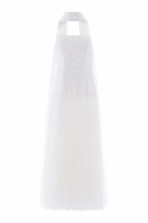 NEW SEASON. The Sunrise Sequin Strapless Cape Gown in Swan White. This elegant strapless gown is embellished with shimmering sequin dot motifs arranged in softly fading linear bands for a luminous finish. Designed with a delicately gathered tulle cape at the back, the flowing silhouette creates refined drama for evening occasions. Perfectly paired with a matching scarf.