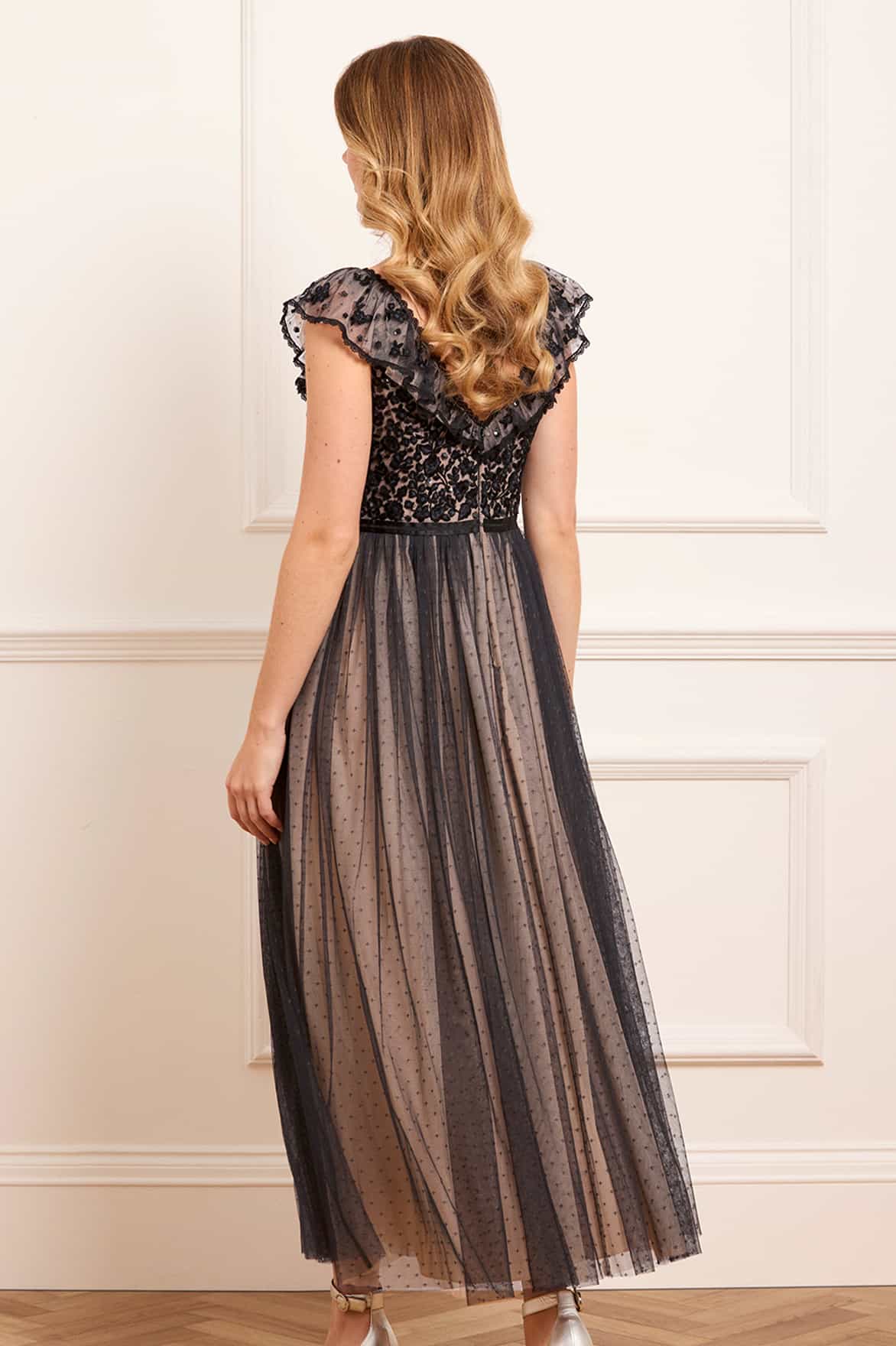 The Adeline Bodice Ankle Gown in Graphite/Beige. A true statement piece for the season. Crafted with heritage-inspired embroidery and signature kisses 'x' tulle, this gown is adorned with shimmering sequin accents that trail gracefully across the bodice and border the skirt in meticulously placed scallops and ribbon motifs. Designed to flatter, the fitted bodice and nipped-in waist create an elegant silhouette, falling into a soft, romantic skirt that glides at ankle length. A striking choice for black-tie events or formal winter soirées, embodying modern femininity with timeless charm.