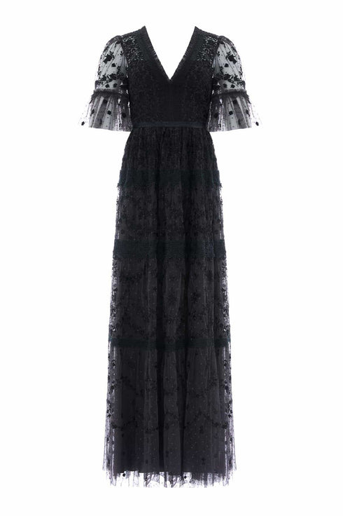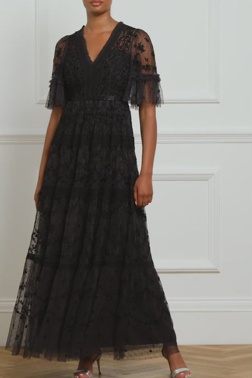 The Araminta Lace Gown in Graphite / Black. This signature Needle & Thread style is designed with an intricately embroidered artwork. Beautifully adorned with lace trims, a layered tulle skirt and a romantic silhouette. The perfect gown for a special upcoming occasion.