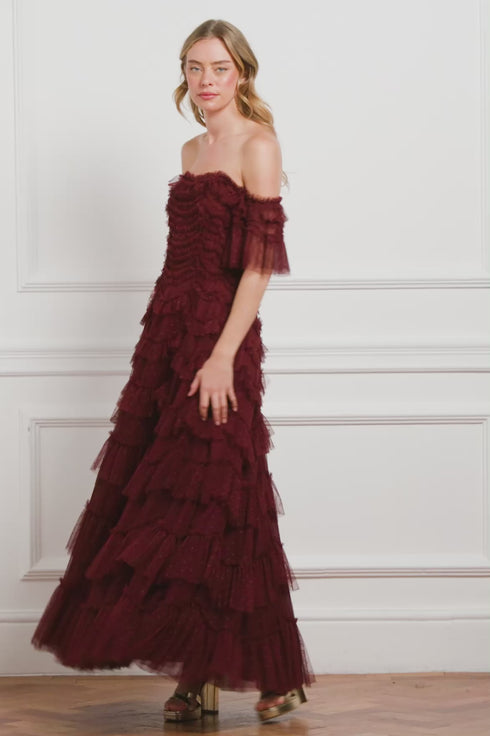 NEW SEASON. The Aviana Off-Shoulder Gown in Claret. A rich reinterpretation of a Needle & Thread signature. Designed with tiered scallop tulle and a romantic off-shoulder neckline, this style blends heritage-inspired textures with a deep wine-red hue.