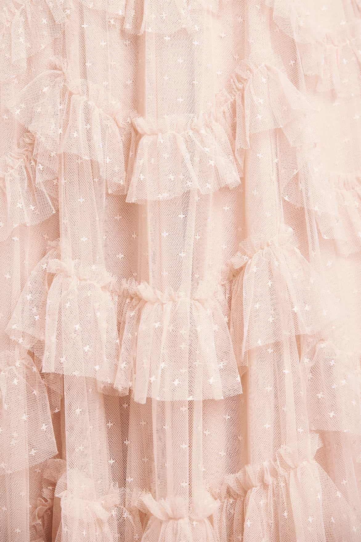 NEW SEASON. The Aviana V-Neck Gown in Oyster. Needle & Thread’s signature textured pieces are reimagined with a beautiful cascading gown in delicate light-toned tulle with a refined neckline. The scalloped frills sweep across the skirt, capturing light and movement with each step.