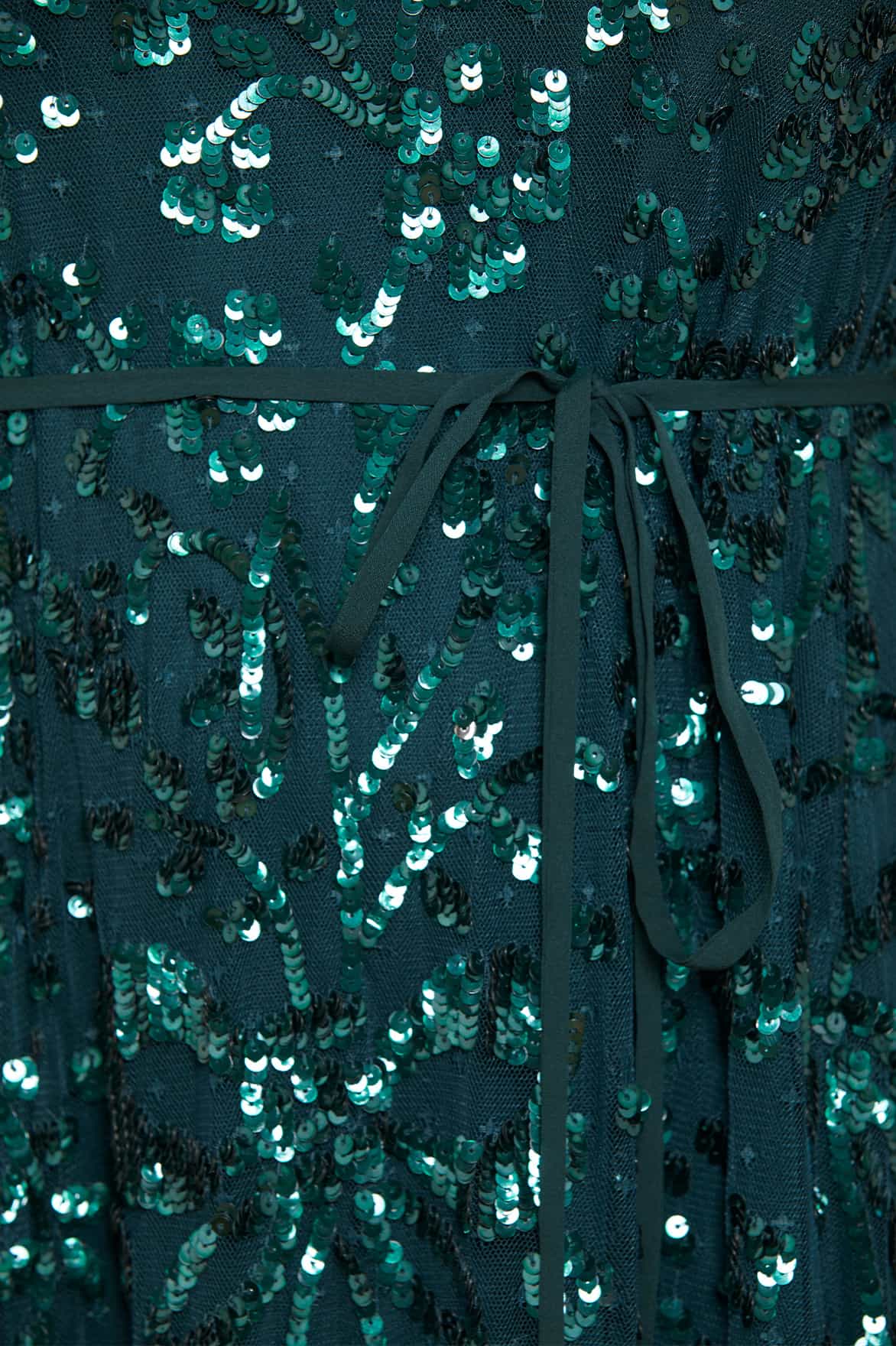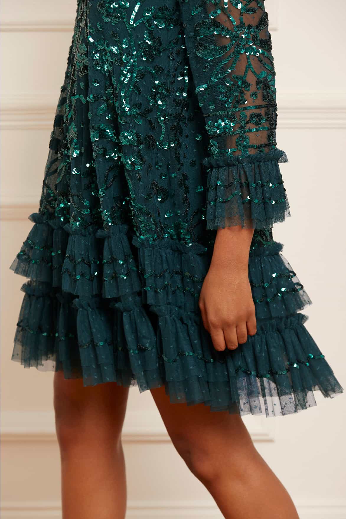 The Celia Long Sleeve Mini Dress in Emerald. This statement long sleeve dress is designed with romantic artwork featuring ornate florals and ribbon bows, densely embellished with shimmering sequins for exquisite detailing. Designed with an effortless loose fit with soft, playful tulle frills on the hem and cuffs. A key piece in our collection.
