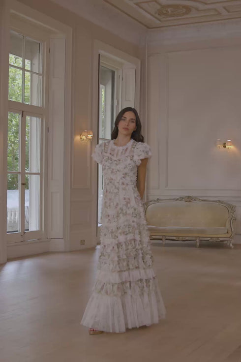 The Colette’s La Vie En Rose Round Neck Short Sleeve Gown in Moonshine/Cream. A dreamy silhouette adorned with delicate tulle frills. Soft ruffles follow the seams of the gown, while romantic florals from the Colette’s Rose print bloom across the moonshine-toned base. A gentle round neckline and short sleeves offer a flattering finish, ideal for refined dressing.