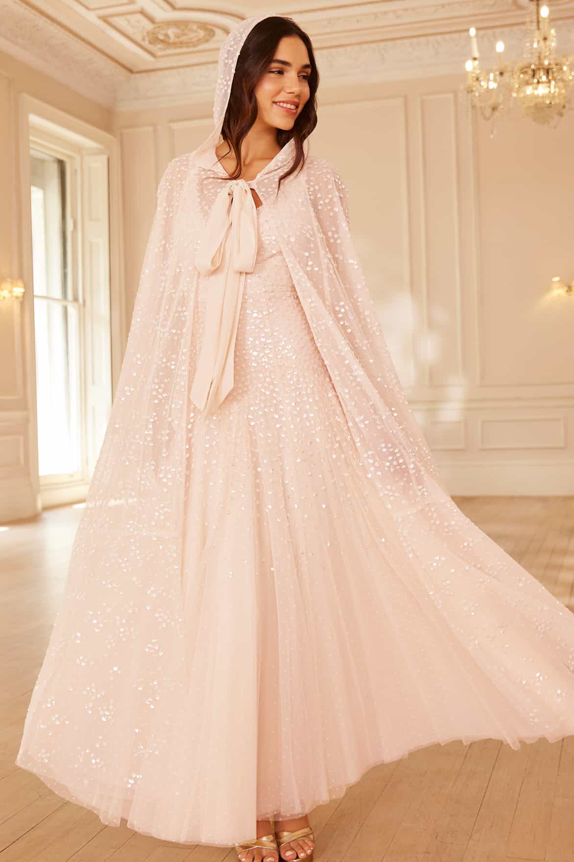 The Dappled Sequin Hooded Long Cape in Cream/Opal. A dramatic statement layer, designed for elegant outerwear moments. Scattered all over with delicate dot sequins that shimmer as they catch the light, the cape features a hood and flowing hem. Style over the Sequin Cascade Cami Plunge Gown for added glamour.