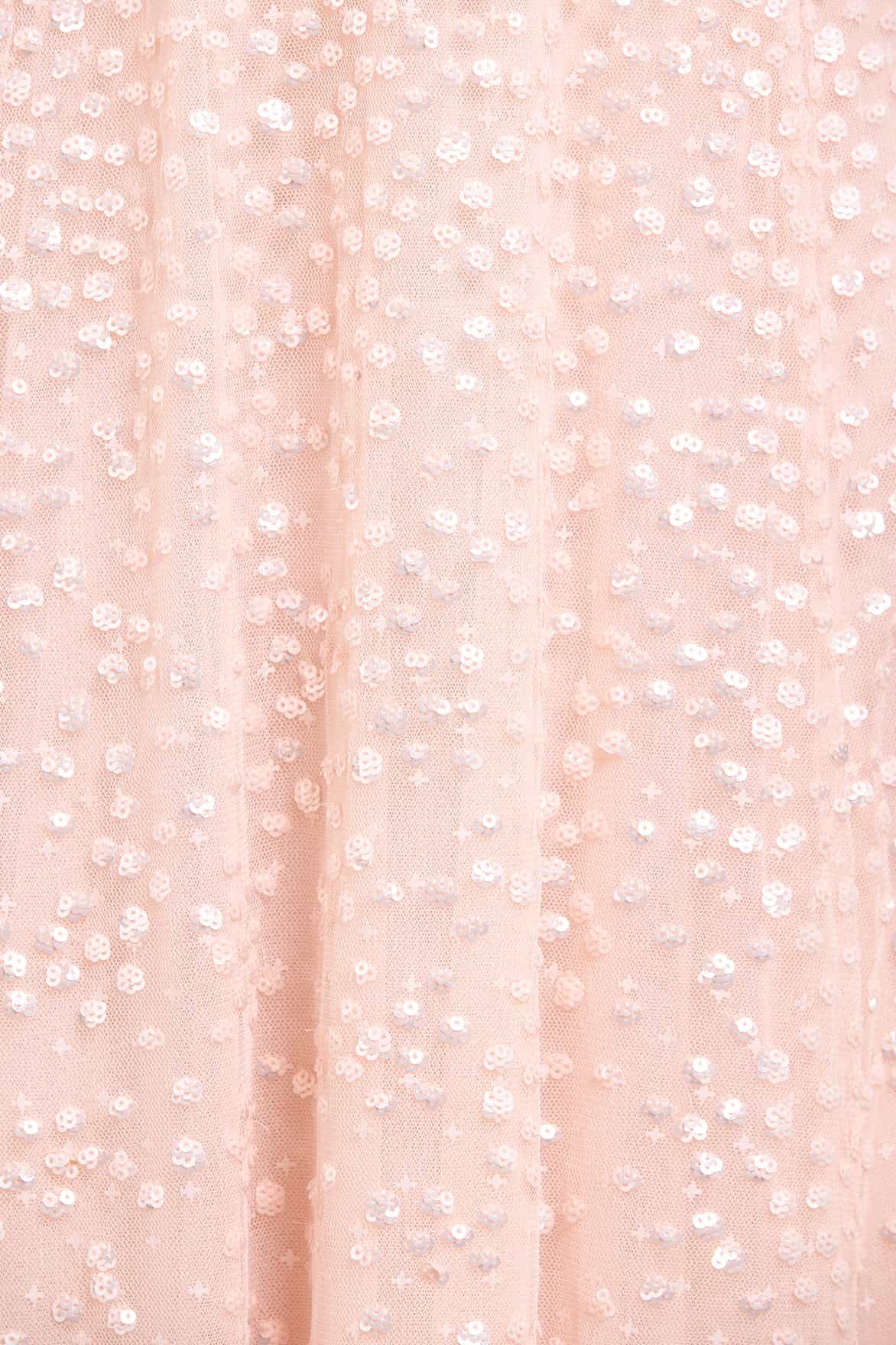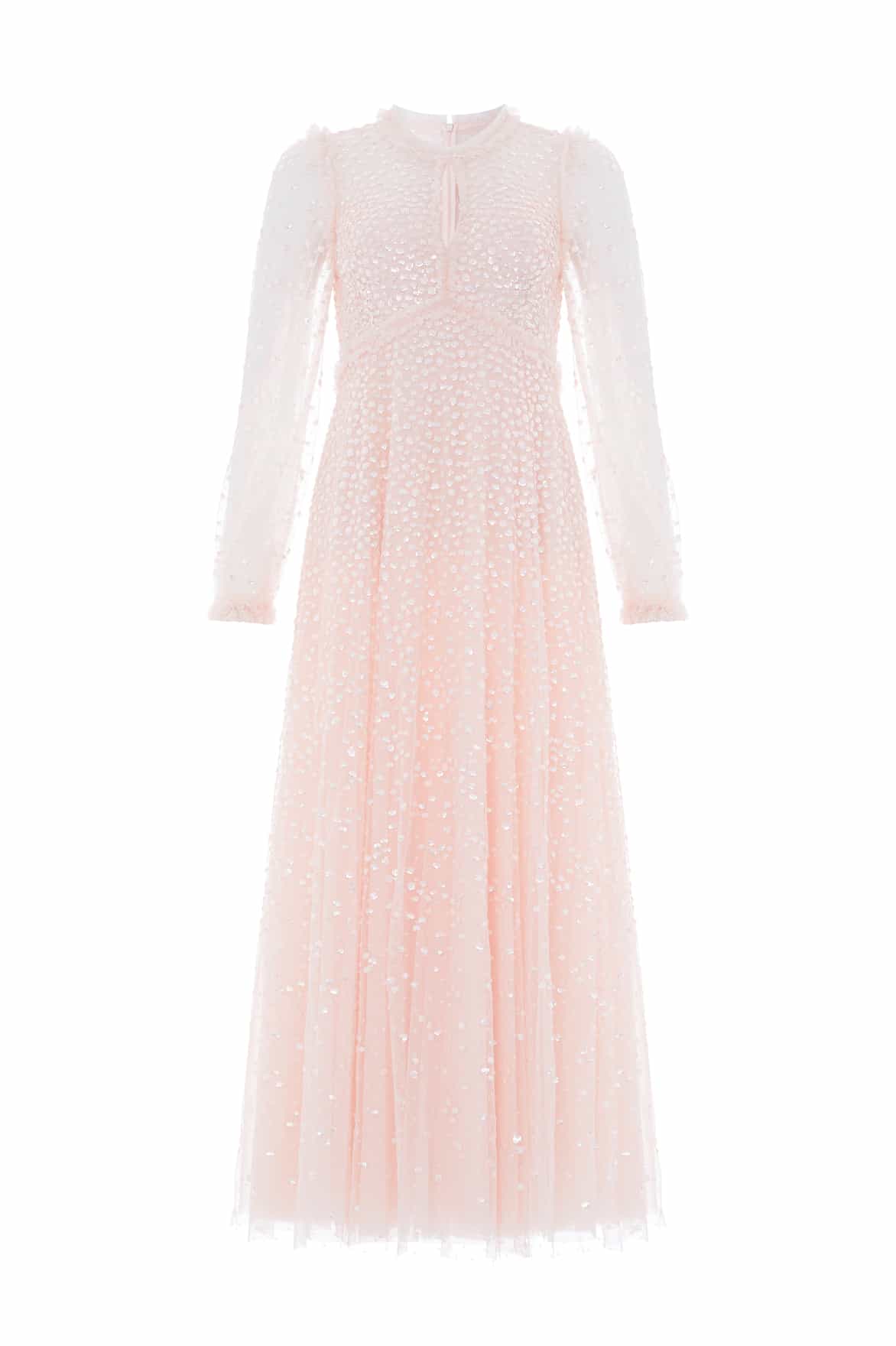 The Dappled Sequin Long Sleeve Ankle Gown in Opal. This look offers a soft and feminine take on evening sparkle. Tiny sequins are meticulously placed across the tulle fabric, fading towards the hem to create a celestial effect. The flattering long sleeves and ankle-length skirt make it a standout choice.
