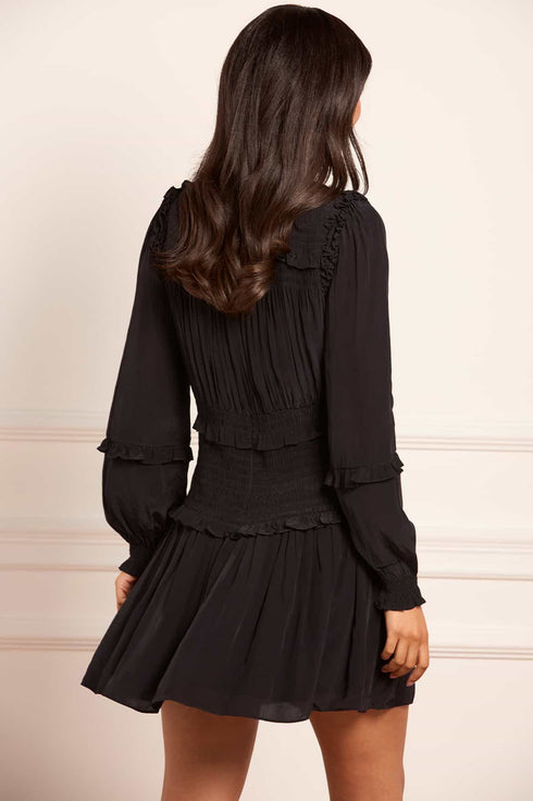 The Emilia Crepe Micro Mini Dress in Graphite. A playful and polished piece cut in a flattering A-line silhouette. This mini features a high neckline, long sleeves and soft draping through the bodice.