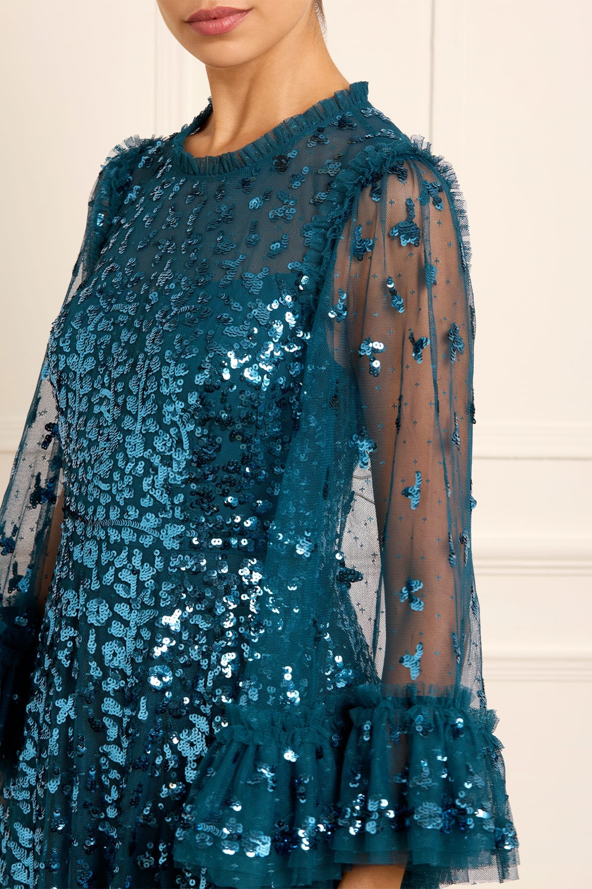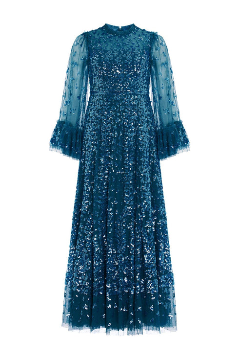 The Fern Ankle Gown in Jewel Blue. Inspired by a historical archive artwork, this gown features a shimmering statement sequin border on the skirt hem with a trailing glittering motif design that disperses towards the dress. Crafted in soft tulle with signature Needle & Thread frills, this luxurious style boasts voluminous sleeves with embellished motifs and romantic frills at the cuffs, adorned with glistening sequins. The sequins have a special high-shine gloss finish created by extra foil coating. The skirt is generously made up of layers of soft, delicate tulle and net. A classic and contemporary style.