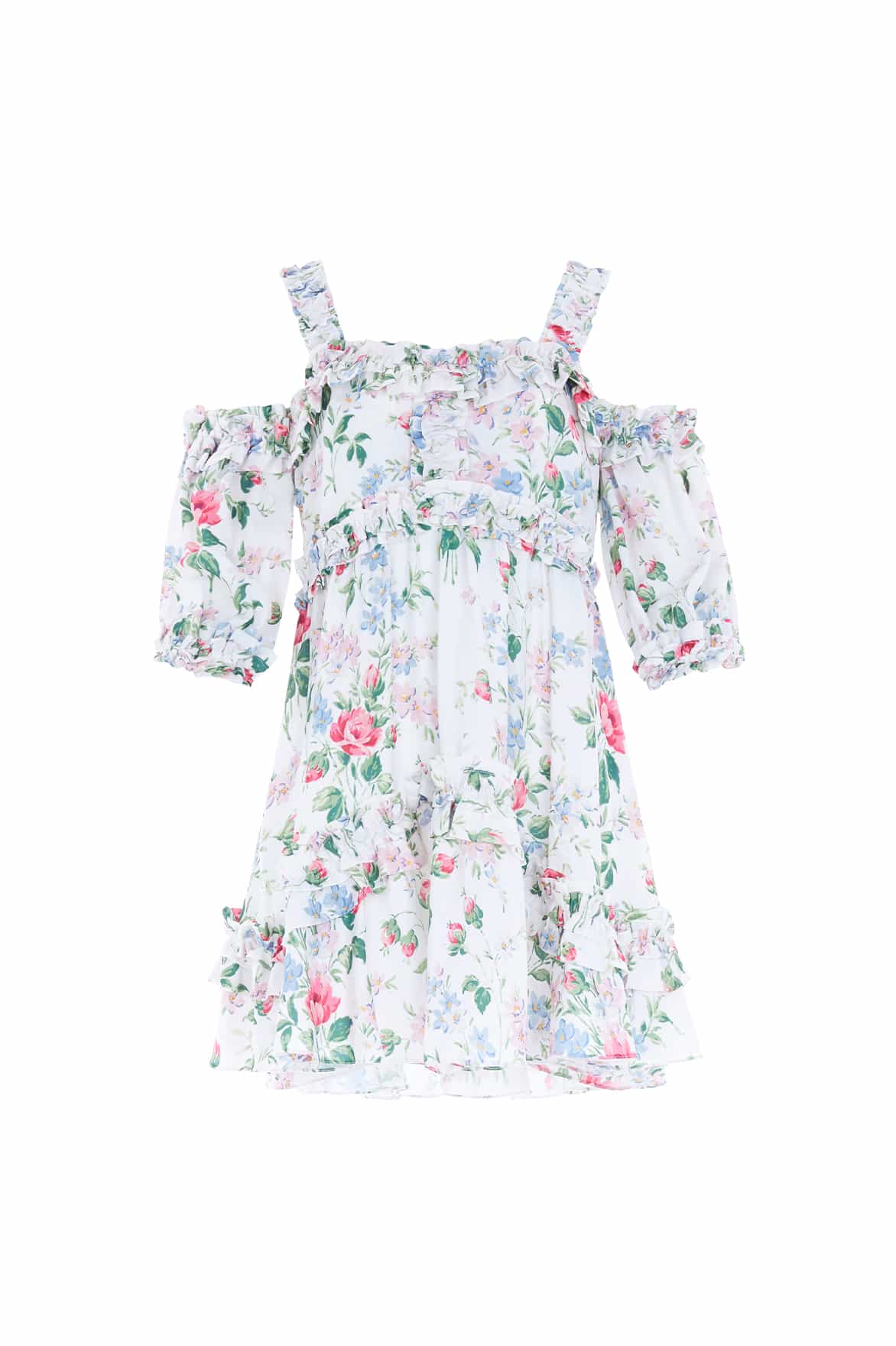 The Floral Fantasy Crepe Off-Shoulder Micro Mini Dress in Moonshine. Designed with a beautiful floral print taken from an early 1900’s hand-painted wallpaper design. Decorated with romantic garden florals that create an all-over, organic layout in a whimsical flower artwork. Designed with a contemporary cold-shoulder detail and signature frills adorning the sleeves and bodice adding a romantic edge. Crafted with a loose-fit silhouette for an effortless, whimsical look. A transitional day to night piece.