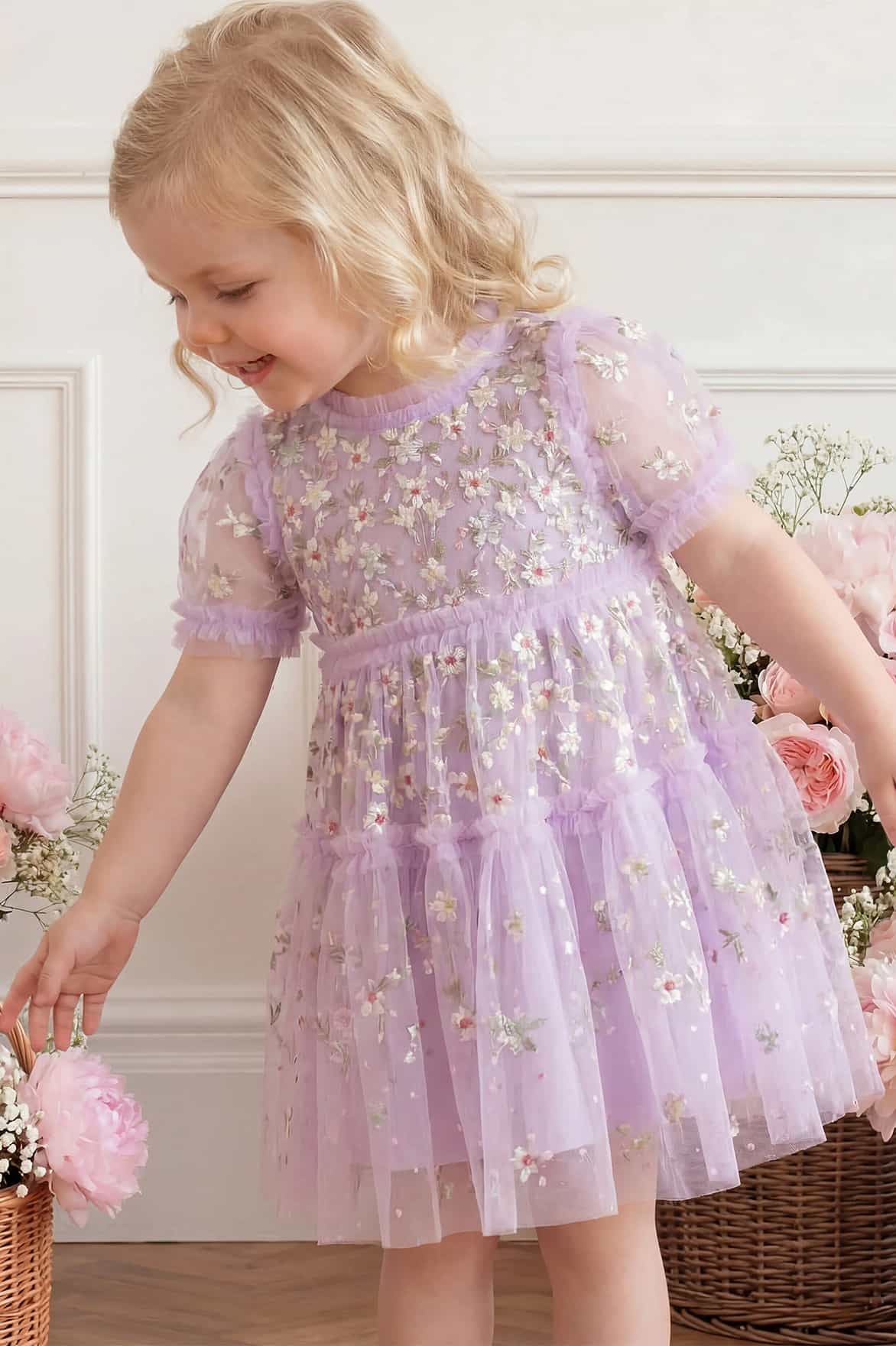 NEW SEASON. The Garland Ribbon Baby Dress in Lilac Pearl/Pastel. Features pastel-toned ribbon embroidery and a softly flared silhouette. Designed for comfort and sweetness, it’s a beautiful piece for celebrations.